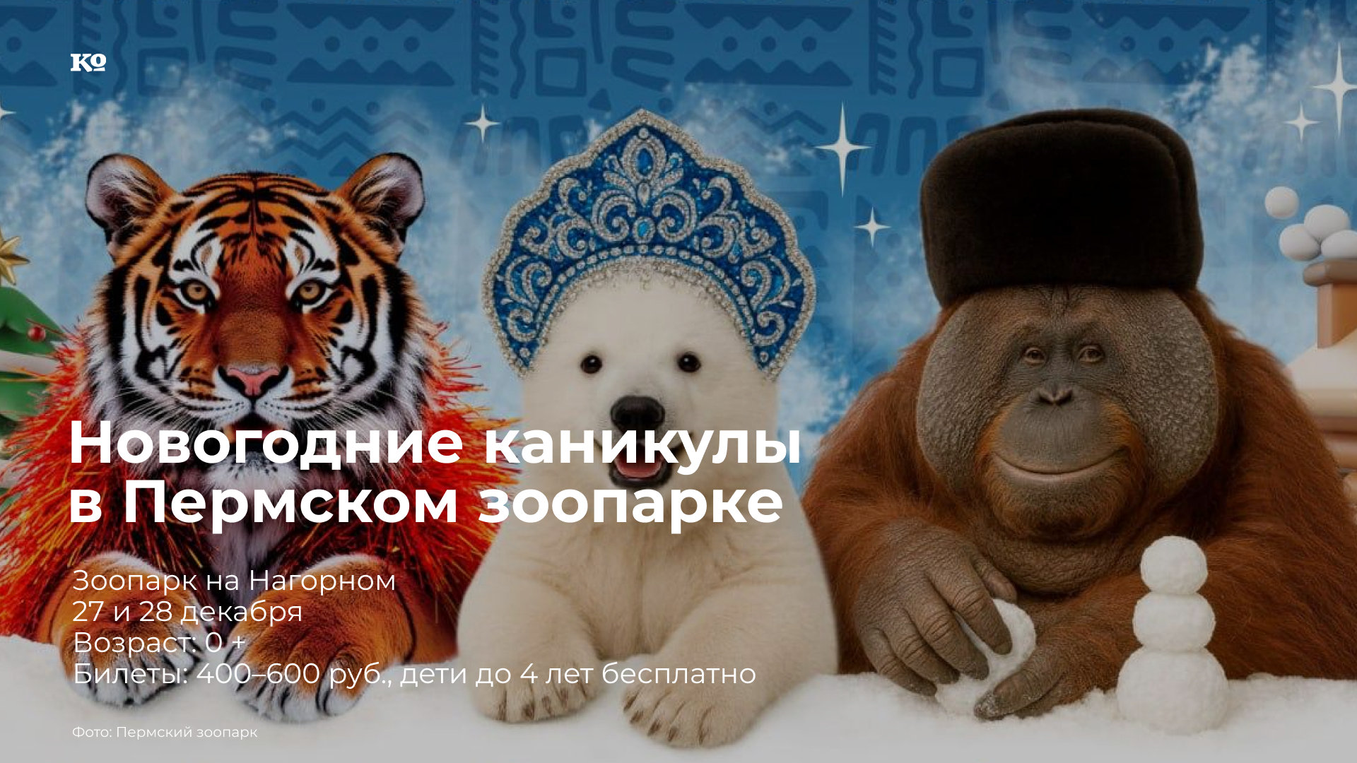В субботу, 27 декабря — «День северного оленя»: арт-площадка, игра «Следуй на Север», показательные кормления приматов и белых медведей. Премьера новогодней игры-приключения «Парма спасает Новый год» в 12:00 и 15:00: медвежонок Парма вместе со Снегурочкой и ребятами отправится на поиски волшебного кристалла, который похитила Снежная королева. В воскресенье, 28 декабря — Главная ёлка зоопарка. В 14:00: открытие главной ёлки, новогоднее игровое представление «Полярная сказка» и награждение победителей конкурса ёлочных игрушек. Также в этот день запланированы показательные кормления животных.