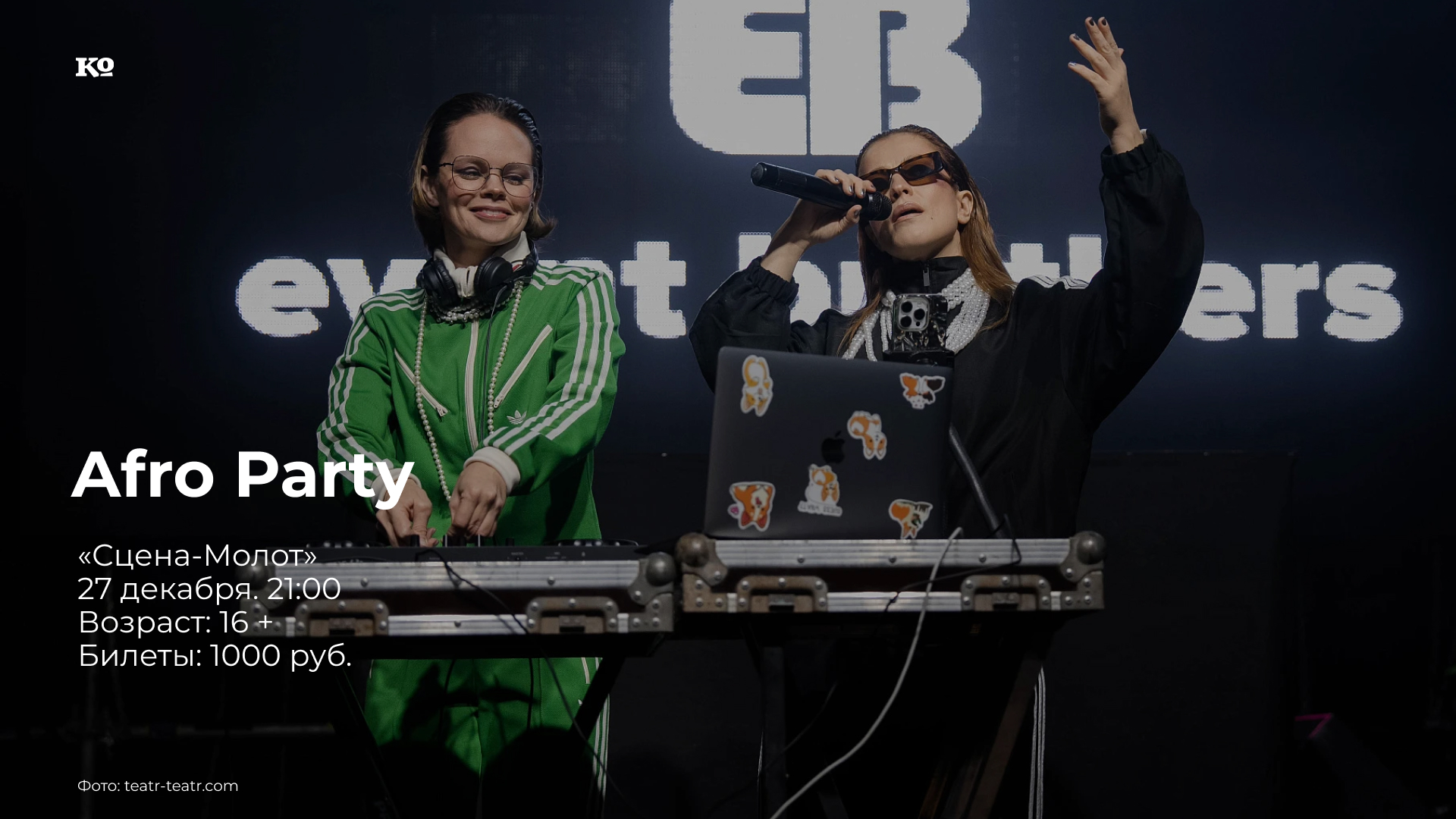Привычное театральное пространство превратится в танцпол, где будет царить дуэт двух Жень — артистки ТТ Евгении Созоновой и Евгении Гибадуллиной. К ним присоединятся артисты оркестра ТТ. Дерзкий DJ-сет и живой вокал в сопровождении скрипки, виолончели, флейты и перкуссии. Вечер, где афро-ритмы переплетаются с атмосферным лайвом, а энергия нарастает буквально по секундам.