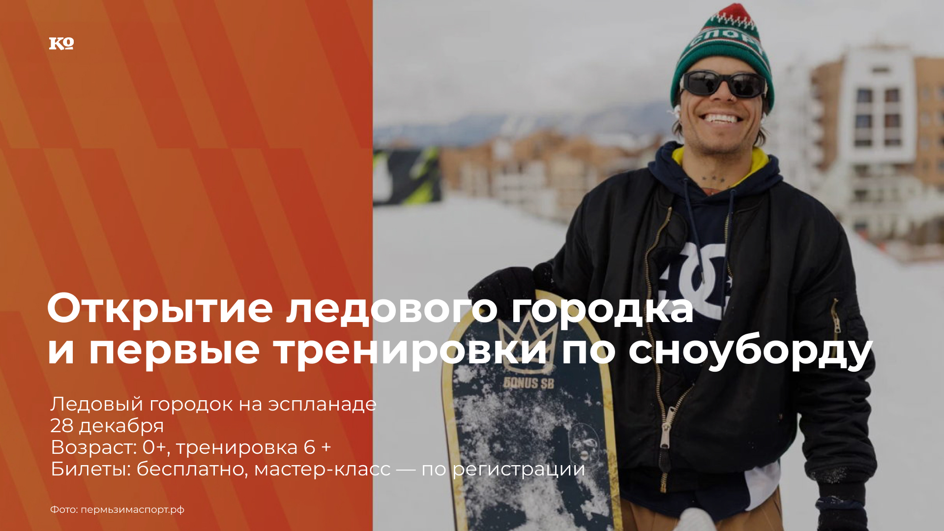 Ледовый городок заработает с 12:00, на горке для тюбинга и сноуборда пройдёт мастер-класс Дениса Бонуса — одного из самых известных сноубордистов России и мира. В программе: показательные прокаты (14:45-15:45), групповые заезды (16:00-20:15), интерактивы и памятные подарки. К участию в мастер-классе приглашаются те, кто уже уверенно стоит на сноуборде и хочет прокачать свои навыки.