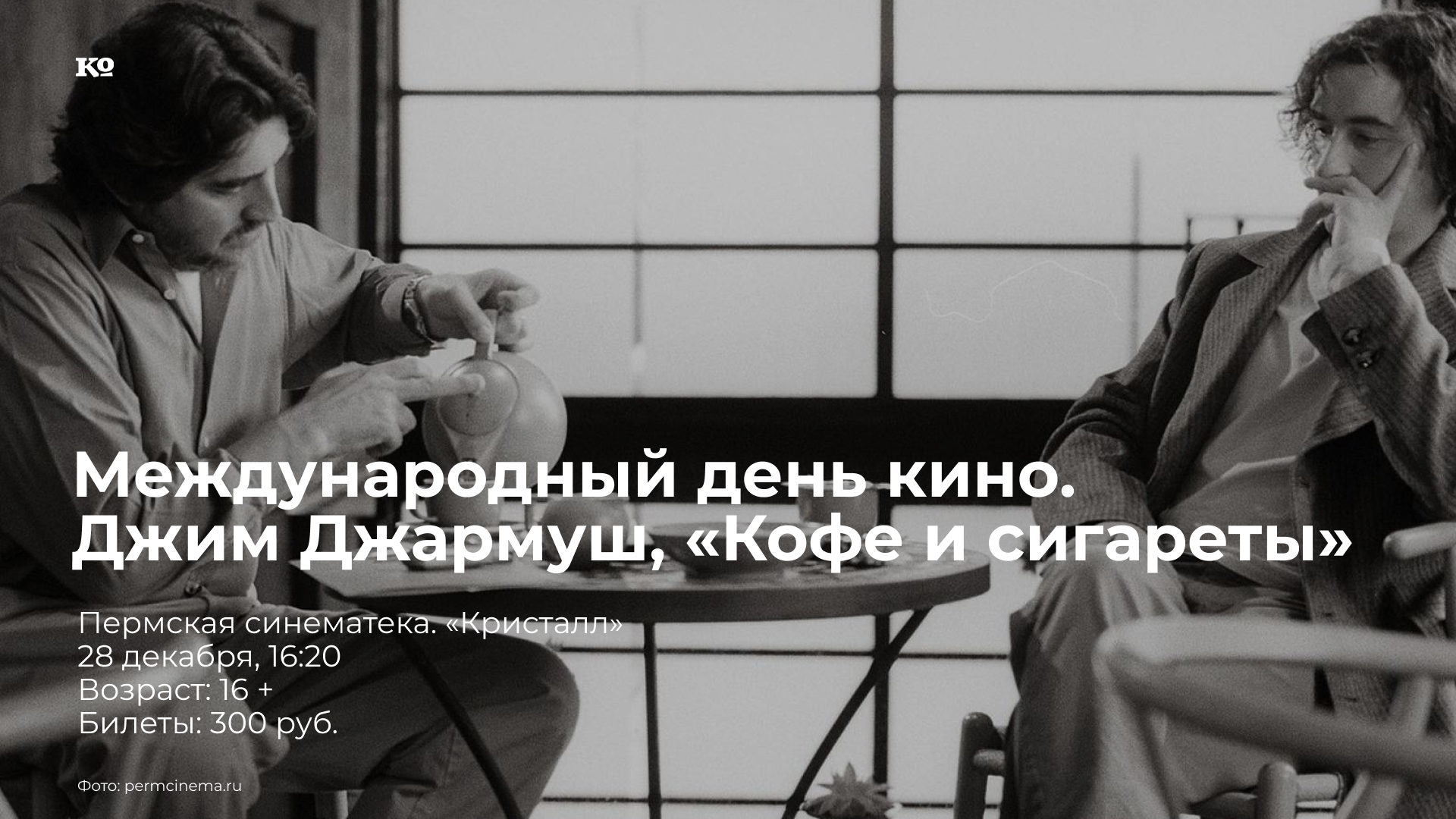 Пермская синематека отмечает Международный день кино и подводит итоги 2025 года вместе со спикерами, которые в течение года сопровождали специальные показы Пермской синематеки. Фильм Джима Джармуша «Кофе и сигареты» станет таким же толчком к разговору, каким стал кофе для героев одиннадцати новелл фильма. Попивая кофе и покуривая сигареты, герои фильма спорят, подшучивают друг над другом, делают глубокомысленные выводы и травят нелепые байки. Фильм обсудят: Александр Чащухин — доцент кафедры междисциплинарных исторических исследований ПГНИУ (знает о повседневности миров Джармуша больше, чем сам Джармуш); Александр Заякин — философ, исследователь городских пространств (расскажет обо всех мыслях, которые рождаются за чашкой кофе); Эдуард Кощеев — сооснователь независимой «Библиотеки Дон Кихота», преподаватель Пермского политеха (человек, который читает быстрее, чем кофе успевает остыть); Ольга Вознесенская — автор тг-канала «Культурный сыр», историк, гид, лектор; Ольга Аверкиева — режиссёр и продюсер, основатель клуба доккино «Доколе» (умеет превращать реальность в кино, а кино — в повод для разговора); Настя Дроздова — куратор специальных показов Пермской синематеки, давний поклонник Джима Джармуша и человек, который всё ещё мечтает о черно-белом мире, где у всех всегда есть минутка на кофе.