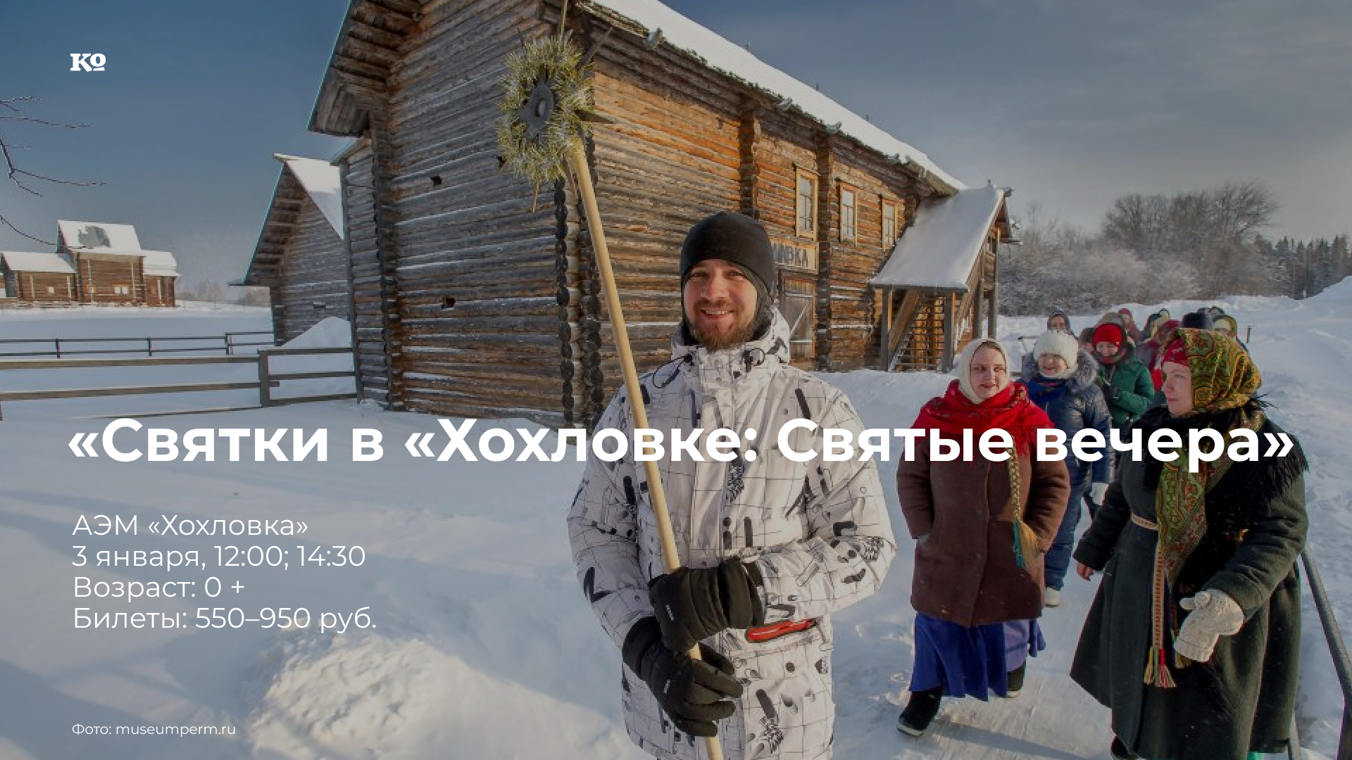 Фольклорный ансамбль музея «Хохловка» подготовил программу, основанную на местных традициях празднования Святок, с ряжением, колядками, гаданиями, вертепным представлением. Часть программы проходит на свежем воздухе, а часть — в уютной избе Н.П. Светлакова. Во время программы гости музея разучат специальные колядки — «христославия», узнают, что такое «козули», и поиграют в местные уличные игры. Завершит праздник вертепное представление «Царь Ирод» и тихие посиделки с деревенскими сказками и рассказами о пермских чудесах, воспоминания о которых сохранились в быличках.
