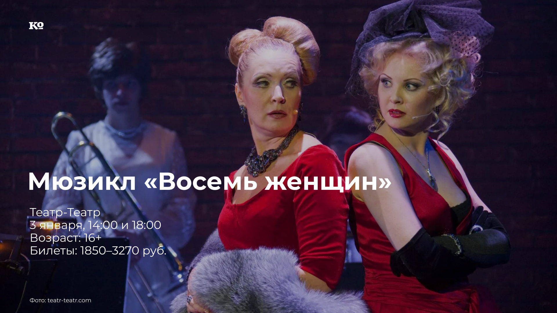 Эффектный мюзикл с детективным сюжетом в постановке Бориса Мильграма, обладатель трех «Золотых масок». В основе спектакля — пьеса Робера Тома, известная по фильму Франсуа Озона «Восемь любящих женщин». Однажды утром главу семейства и хозяина дома находят мертвым в спальне. Его близкие родственницы, супруга, дочери и служанка устраивают собственное расследование и поиск убийцы. Полудетективная история подана как искрометная, ироничная музыкальная постановка в стиле кабаре, где у каждой из героинь есть своя отдельная партия, а зритель становится соучастником блистательного мюзикла. Блистательный ансамбль актрис: Елена Старостина, Екатерина Романова, Владислава Костылева, Татьяна Виноградова, Мария Полыгалова, Анна Сырчикова, Ольга Пудова, Анна Огорельцева.