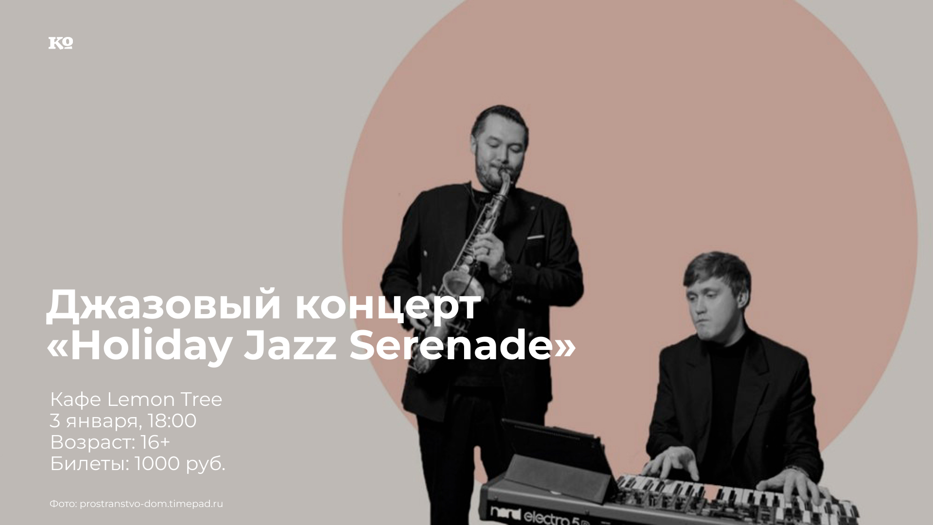 Праздничный концерт с музыкантами из Екатеринбурга Денисом Давыдовым (саксофон) и Вячеславом Жижилевым (фортепиано). Holiday Jazz Serenade — музыкальная сюита, где каждая композиция становится маленьким новогодним праздником. В программе вечера — лучшие образцы джазовой классики и авторские интерпретации знаменитых рождественских мелодий.