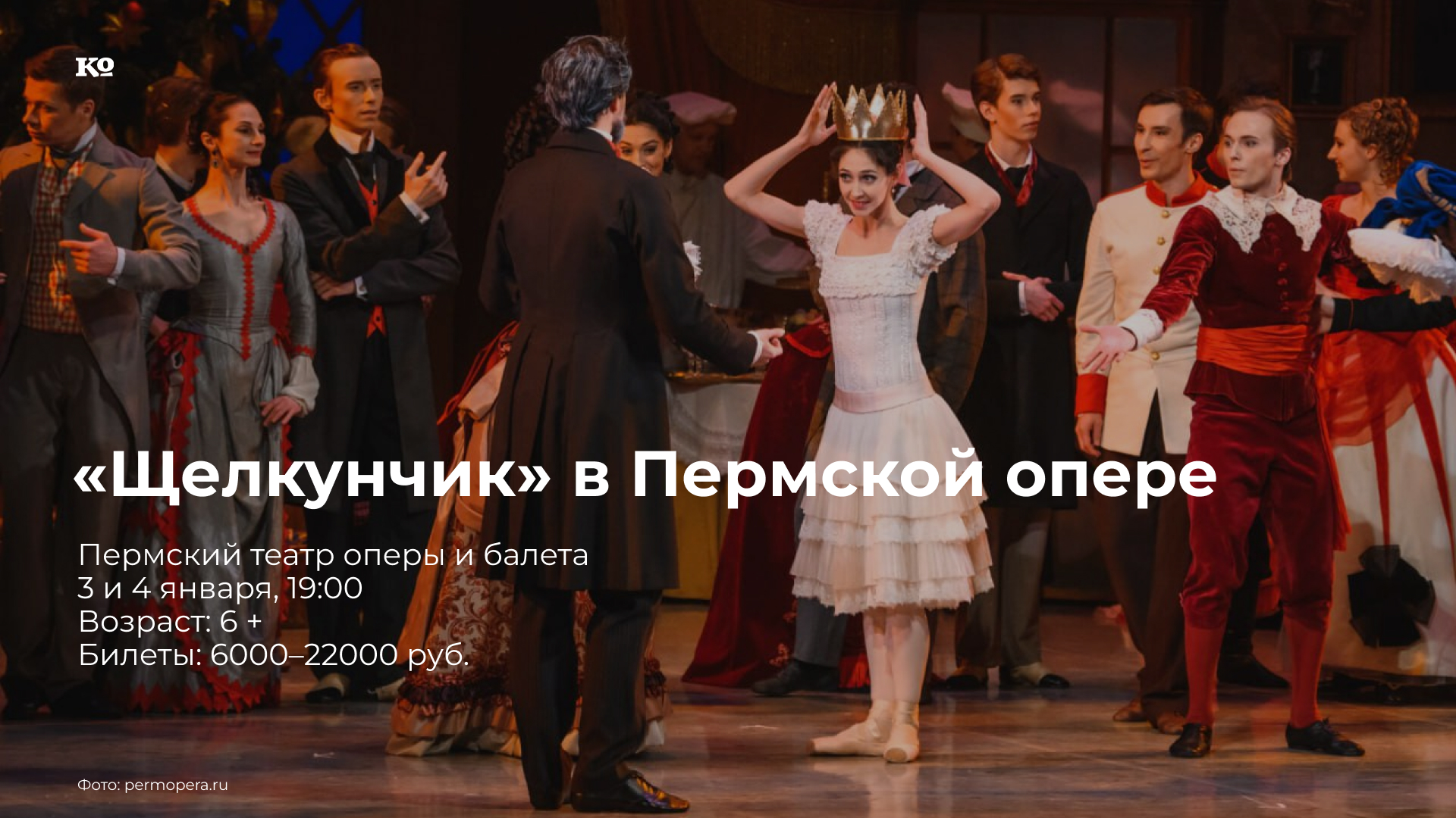 Балет написан в 1892 году, в авторской версии Алексея Мирошниченко впервые представлен в Перми в 2017 году. Действие «Щелкунчика» перенесено в Петербург 1892 года. Именно в этом году в Мариинском театре состоялась его мировая премьера. Это история о взрослении, о том, как уходит детство, но вместо него приходит романтическая юность. Новый год здесь — символ хода времени и надежды на хорошее будущее. Главные партии исполнят: 3 января — Анн-Жуллиет Пинейро и Сергей Угрюмов, 4 января — Диана Куцбах и Никита Талалаев.