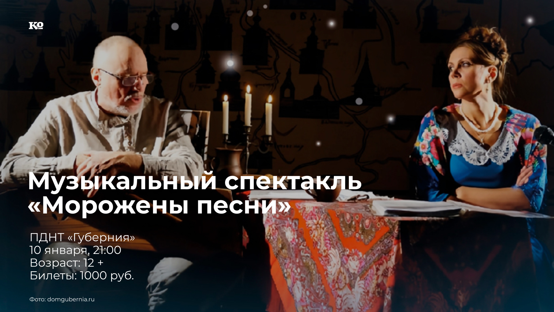 Спектакль по произведениям Степана Писахова исполняют Сергей Старостин и Татьяна Бондаренко. Сказки Писахова воспевают чудесный мир Русского Севера, преподнося его как удивительную сказочную страну, где всё, что ни пожелаешь, может случиться: медведь решит торговать молоком, северное сияние даже детям легко заготовить впрок, а на вечных льдинах можно путешествовать по Онеге. «Морожены песни» дают зрителю возможность побывать в мире сказочном, с одной стороны, и абсолютно реальном, с другой. Подлинное пиршество воображения и живая вода русской речи. В спектакле прозвучат озорные и нежные «зимние» тексты Александра Антонова (Шаньги), нашего современника.