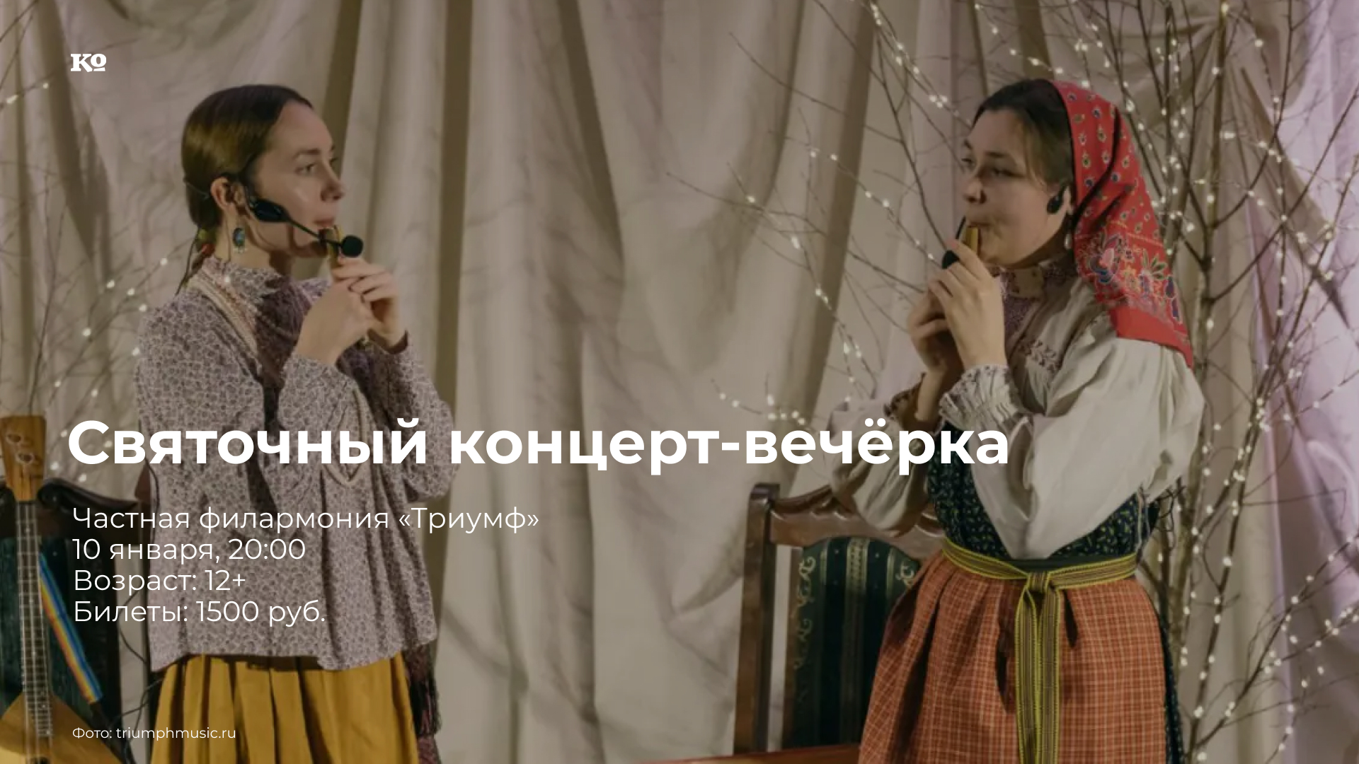 Песни, гадания, разговоры – святочный концерт-вечёрка в исполнении фолк-певиц Глафиры Утёмовой и Даши Калиной, участниц пермского ансамбля «Цветьё». В программе – рождественские и святочные песни Пермского края, звучание гуслей, балалайки и традиционных коми-пермяцких пэлян. Гости смогут принять участие в настоящих святочных гаданиях, традиционном игровом хороводе или пляске, погрузиться в атмосферу народных зимних Святок.