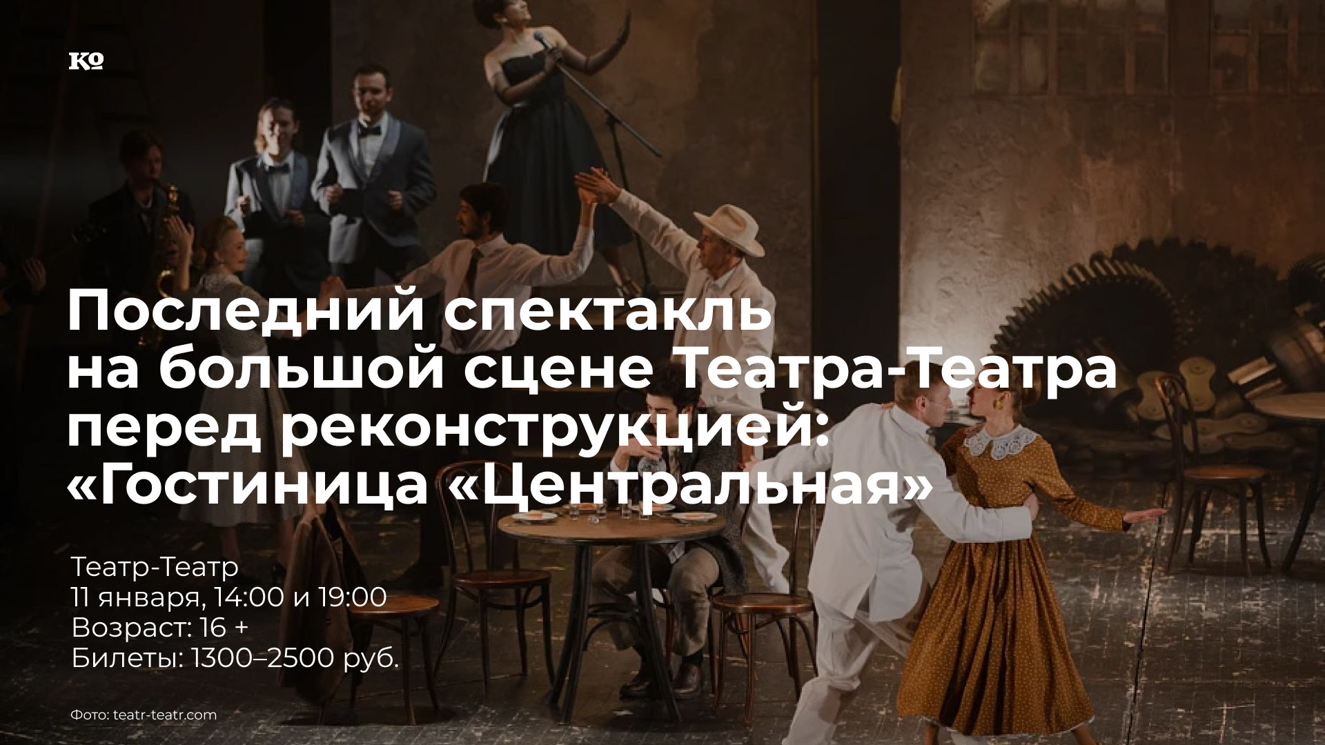 Спектакль-открытка с любовью к Перми. Для создателей спектакля гостиница «Центральная» – метафора генетической и культурной памяти, памяти места и памяти вообще. Здание, расположенное на перекрёстке улиц Сибирской и Советской, стало перекрёстком множества судеб. Авторы спектакля рассказывают о знаковой для города «семиэтажке» через три временных пласта: 1940-е годы, 1960-е, современность. Разные поколения «соединяет» в одном пространстве оригинальный ход: зрители словно оказываются на съёмочной площадке, где создаётся фильм про гостиницу и её постояльцев, про Пермь и её жителей. В основе литературного текста лежит огромный пласт документальных материалов, воспоминаний, интервью, песен и стихов. Спектакль, как вскрытая капсула времени, напоминает о ярких фактах истории Перми и знакомит с интересными человеческими судьбами, ведь «история – это всегда люди». До окончания реконструкции большого зрительного зала спектакль исполняться не будет.