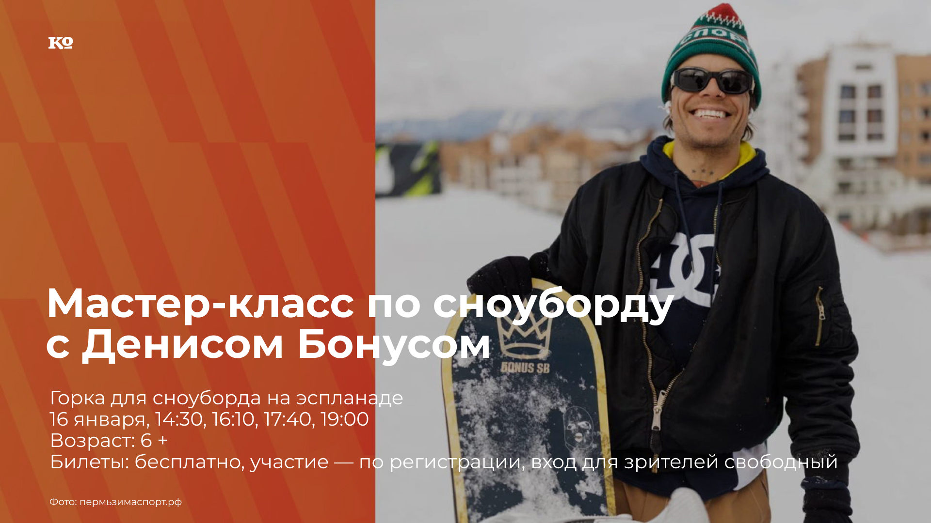 Денис Бонус — один из самых известных сноубордистов и джибберов России и мира — всё-таки намерен доехать до Перми. Он поделится своим опытом и проведёт авторские мастер-классы для тех, кто уже уверенно стоит на сноуборде и хочет прокачать технику. Для зрителей предусмотрены развлекательные интерактивы, а для участников — памятные подарки. Мастер-класс должен был пройти в конце декабря, на открытии фестиваля зимнего спорта, но не состоялся из-за отмены авиарейса.