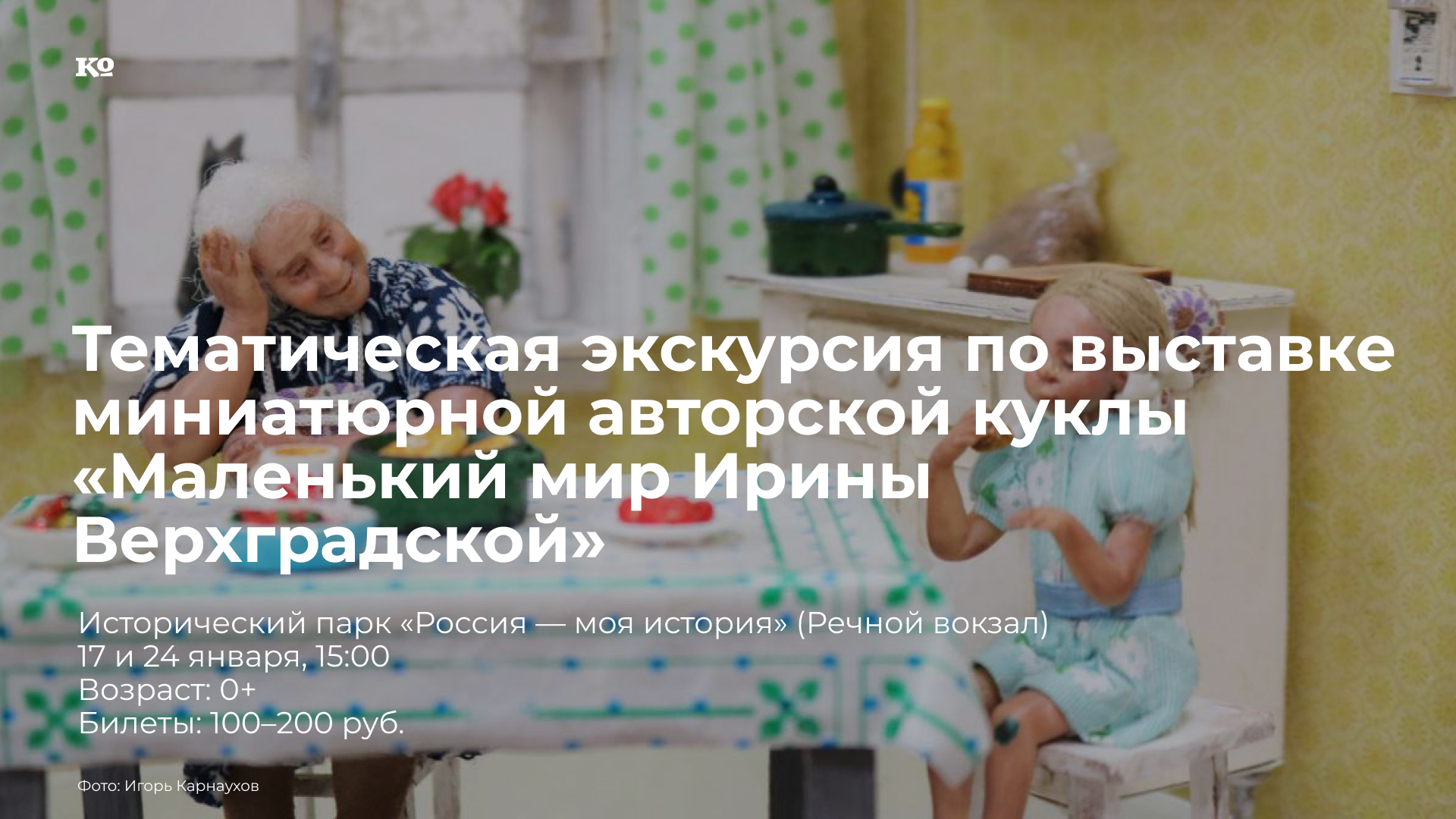 Экскурсовод исторического парка Олеся Шишкина-Короленко приглашает ненадолго вернуться в детство, окунувшись в общество кукол Ирины Верхградской (Новосибирск). Это не просто искусно созданные персонажи: за каждым угадывается прошлое, подчас целая жизнь, несмотря на то, что герой или героиня — с ладонь. Особенно это относится к коллекции «Дорогие мои старики» — глядя на фигурки из этой серии, посетители смахивают слезинку и звонят родителям. Здесь же — миниатюрные портреты исторических личностей, популярных отечественных артистов, голливудских кинозвёзд; герои сказок и литературные персонажи. В разделе «История костюма» — миниатюрные куклы-модели в костюмах народов мира. Экскурсовод расскажет о жизненном пути художницы и её авторской технике — грунтовании по текстилю.