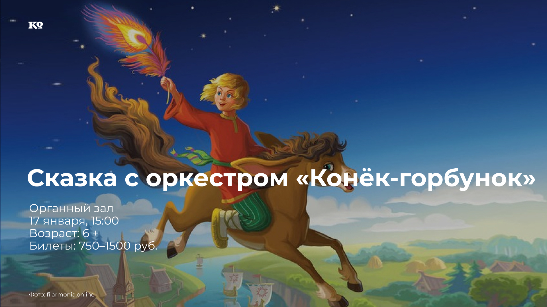 Знакомая с детства история о смелом Иванушке и его верном друге — лошадке в прочтении лауреата всероссийских фестивалей и конкурсов, номинанта «Золотой маски», ведущего артиста Театра-Театра Альберта Макарова прозвучит в сопровождении Оркестра русских народных инструментов имени В. А. Салина под управлением маэстро Галины Токаревой. Мелодии Лядова, Стравинского и других композиторов оживят чудеса Жар-птицы, Царь-девицы и волшебного конька.