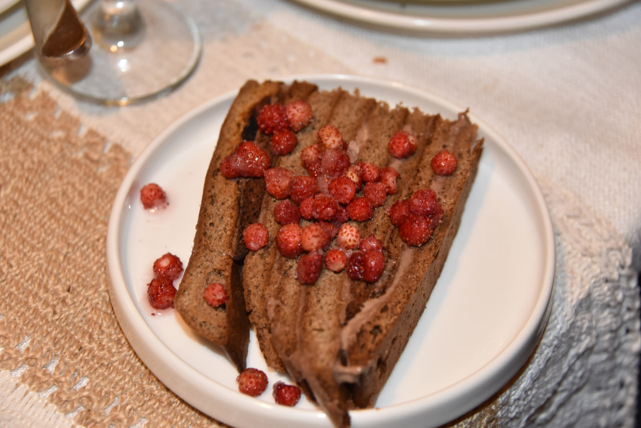 Ужин завершился тортом из черёмуховой муки с лесной земляникой и непременным травяным чаем.