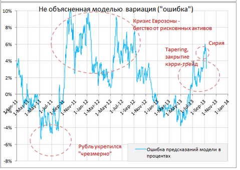 Между тем рубль растет, пробил отметку 33 руб./$. Сокращается разбег между наблюдаемым курсом и прогнозируемым нашей моделью с 6% на фоне нарастания напряжения вокруг Сирии (3 сентября) до текущих 3,2%. Модель предсказывают курс рубля в зависимости от инфляции и цен на нефть. Такой фактор как геополитика в модель на заложен, и его влияние на курс идентифицируется как ошибка модели. При текущих ценах на нефть рубль должен торговаться на отметки 31,9 руб./$, но на него продолжает давить сворачивание QE и ослабевающий геополитический фактор. Если посмотреть на второй график, то влияние Сирии отыграно.