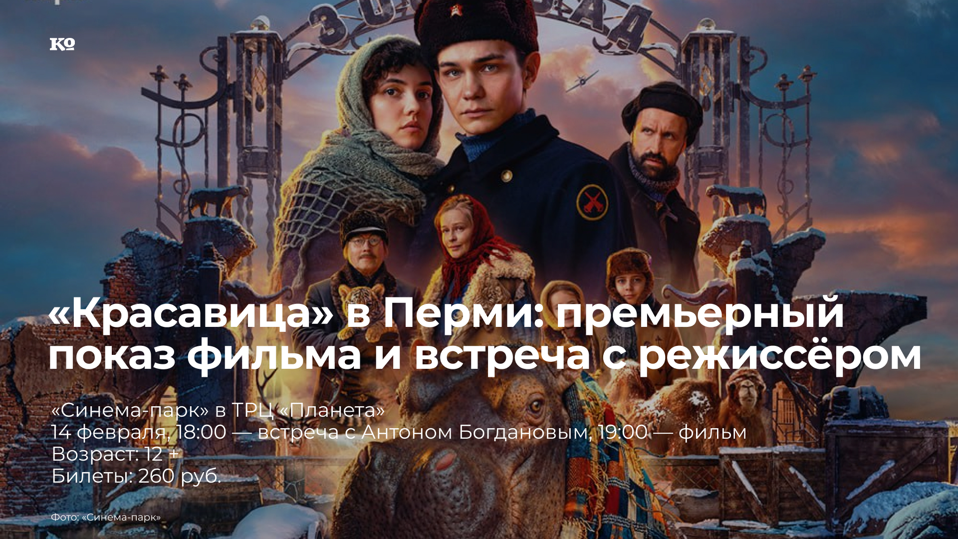 Предпремьерный показ фильма «Красавица» — трогательной истории о милосердии и любви ко всему живому, основанной на реальных событиях. Декабрь 1941 года. Ленинград. Блокада. Главный герой вместе с другими сотрудниками зоопарка спасает от обстрелов животных. Люди сами находятся на грани жизни и смерти, но не бросают бегемотиху по кличке Красавица. Фильм лично представит режиссёр Антон Богданов.