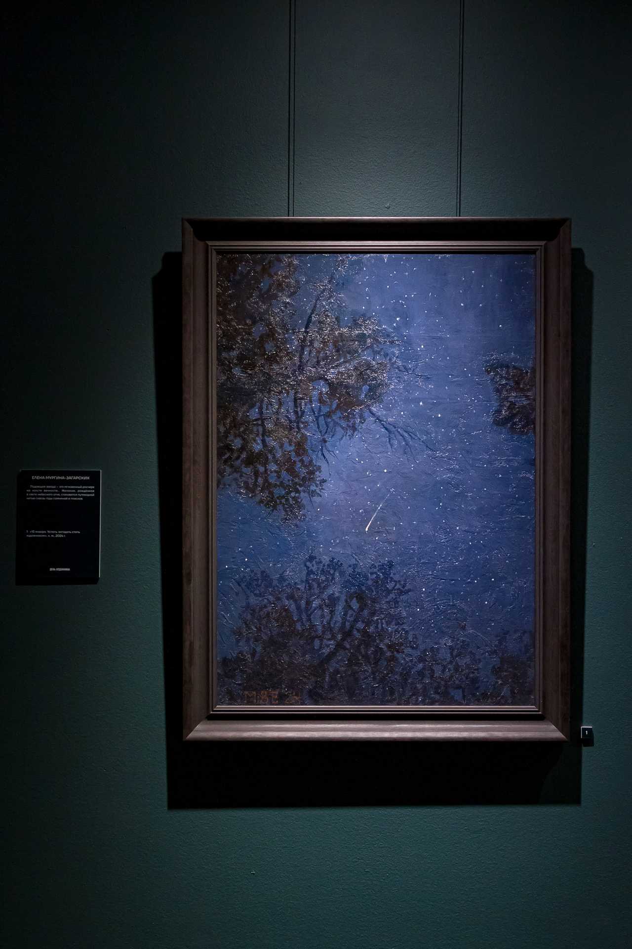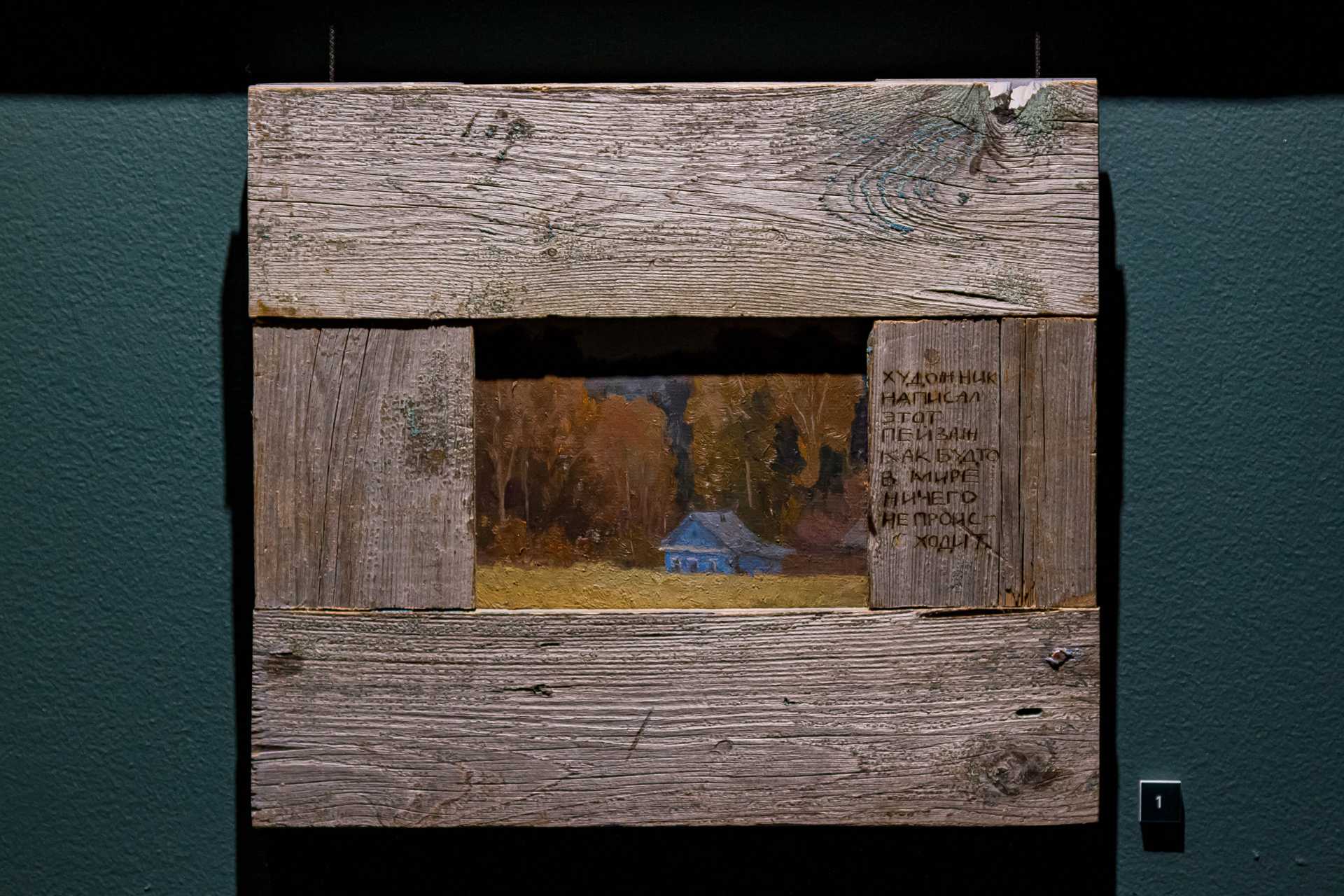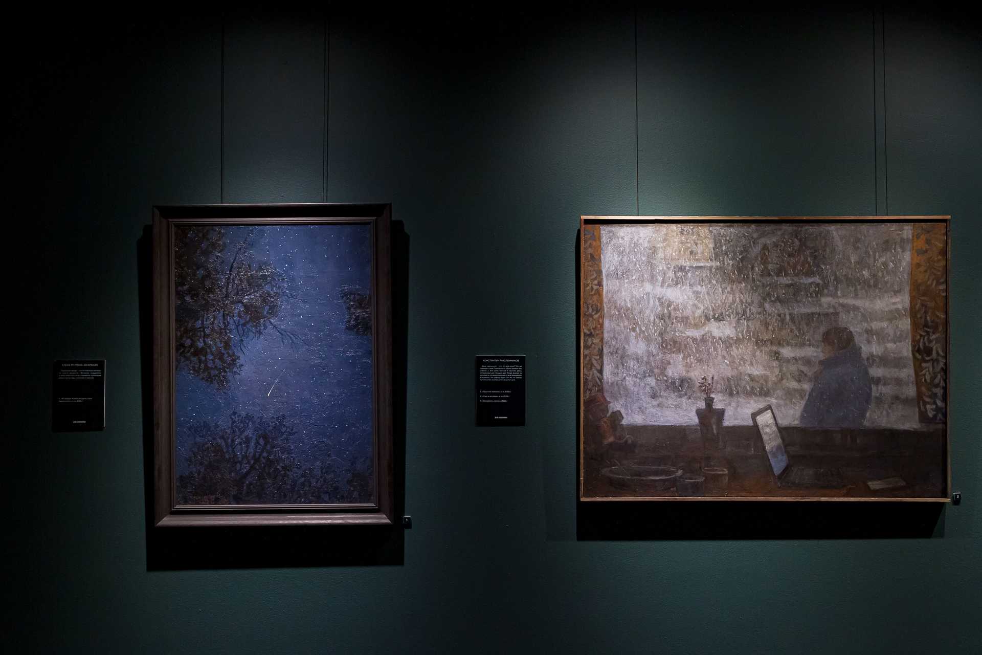 Если изучить отзывы о выставке в соцсетях, то окажется, что чаще всего зрители постят картину Елены Мургиной-Загарских «15 января. Успеть загадать стать художником» и небольшой пейзаж Константина Масленникова, который так и называется — «Простой пейзаж». Первая из этих работ — это взгляд вверх, на верхушки деревьев и падающую звезду, практически иллюстрация к Канту: «Звёздное небо над нами и нравственный закон внутри нас», а вторая — действительно, как бы пейзаж… Малюсенький домик в тени огромных деревьев, но это полотно забрано в раму из суровых, толстых, грубых досок, на которых выжжена надпись: «Художник написал этот пейзаж, как будто ничего не происходит».
