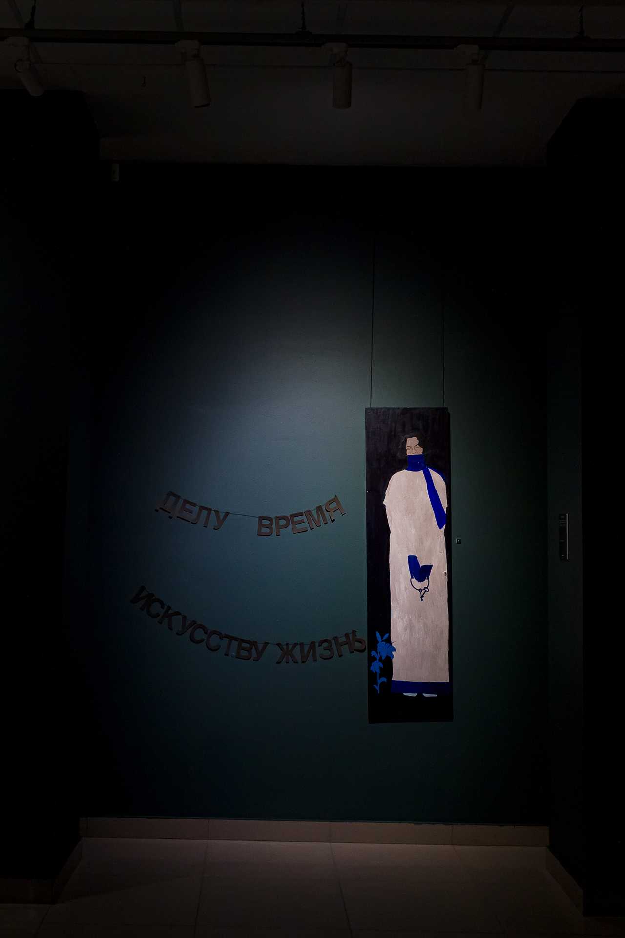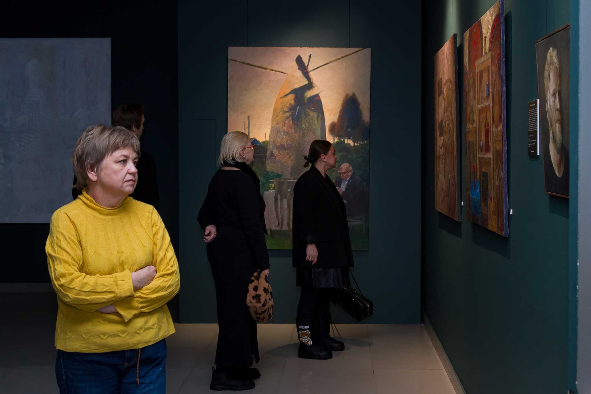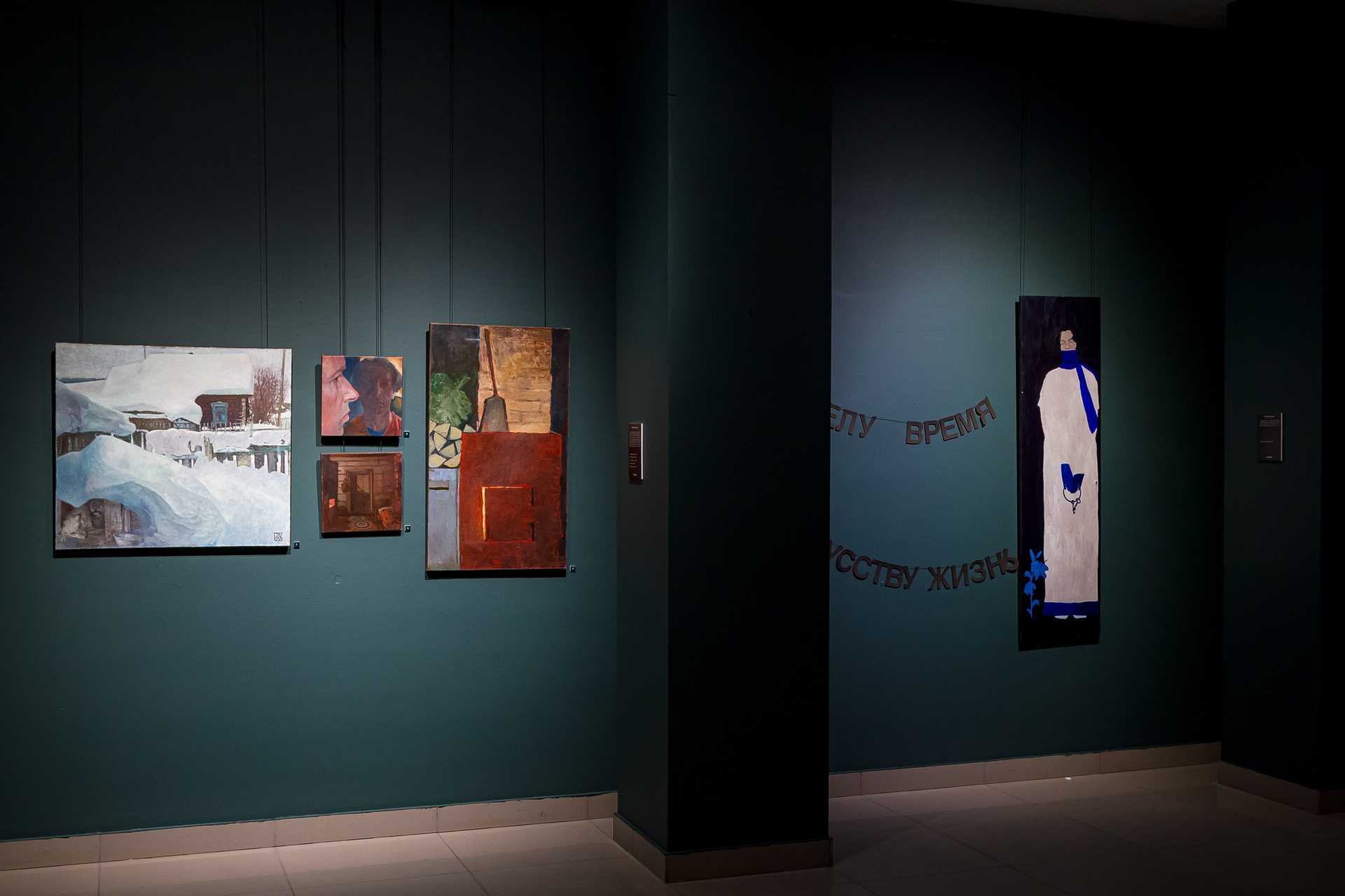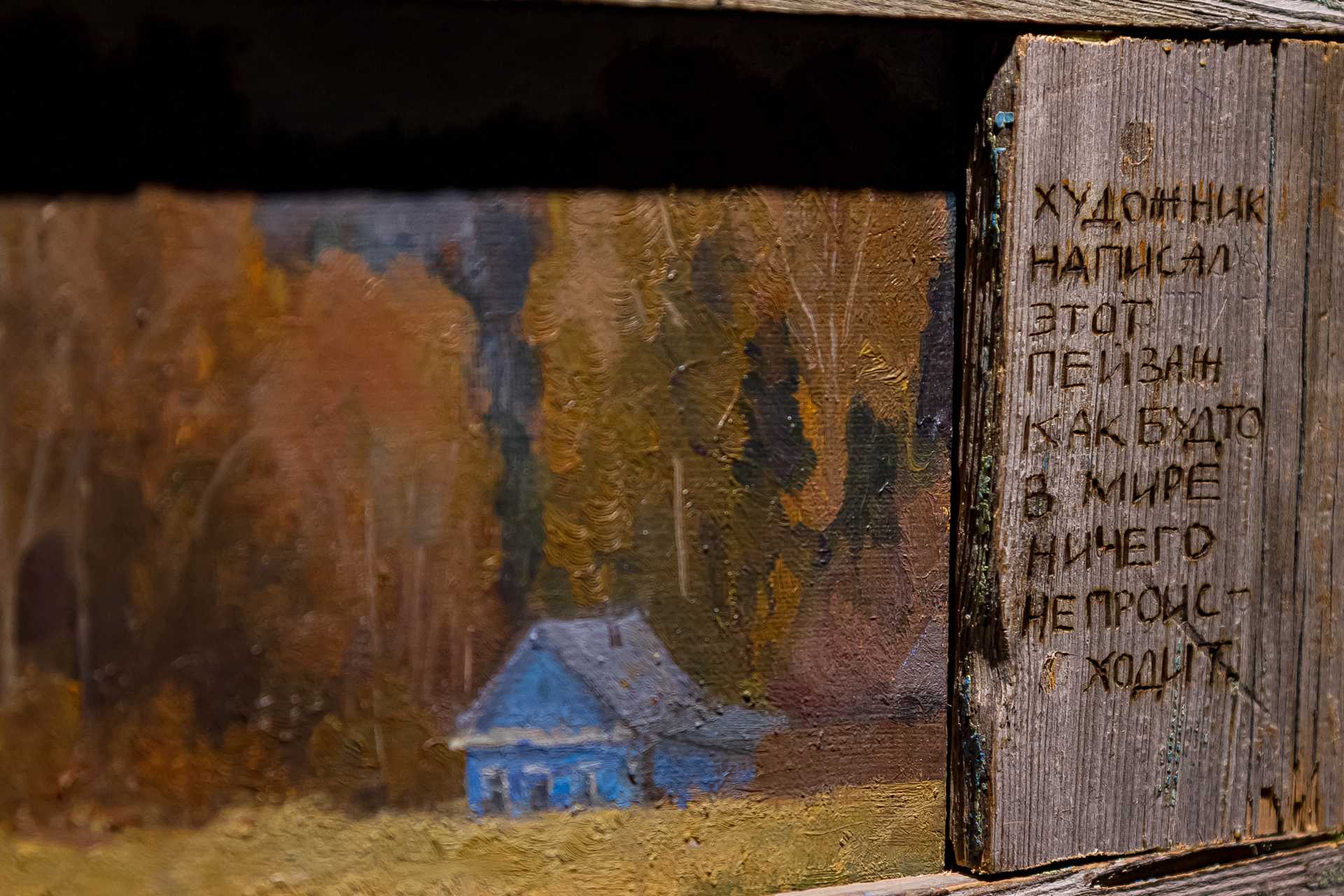 Если изучить отзывы о выставке в соцсетях, то окажется, что чаще всего зрители постят картину Елены Мургиной-Загарских «15 января. Успеть загадать стать художником» и небольшой пейзаж Константина Масленникова, который так и называется — «Простой пейзаж». Первая из этих работ — это взгляд вверх, на верхушки деревьев и падающую звезду, практически иллюстрация к Канту: «Звёздное небо над нами и нравственный закон внутри нас», а вторая — действительно, как бы пейзаж… Малюсенький домик в тени огромных деревьев, но это полотно забрано в раму из суровых, толстых, грубых досок, на которых выжжена надпись: «Художник написал этот пейзаж, как будто ничего не происходит».