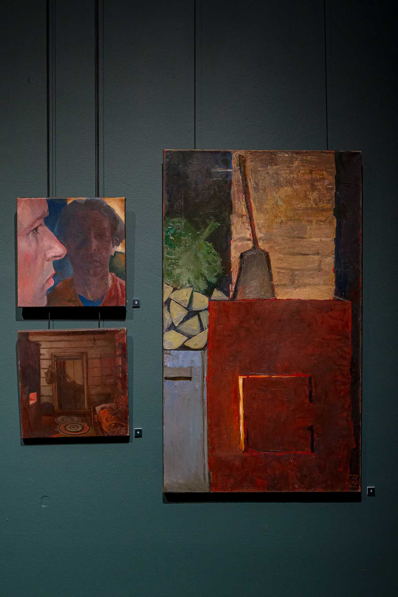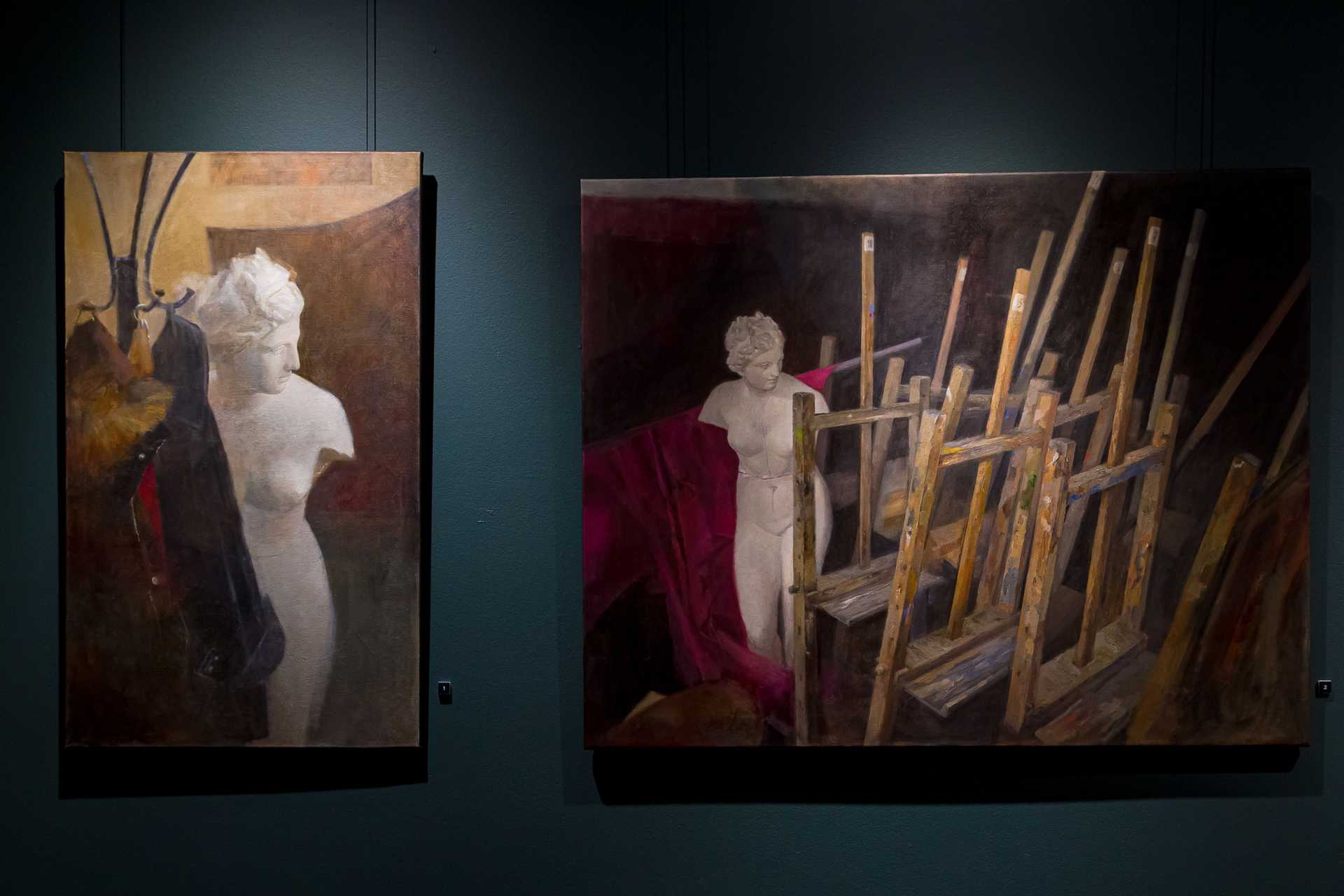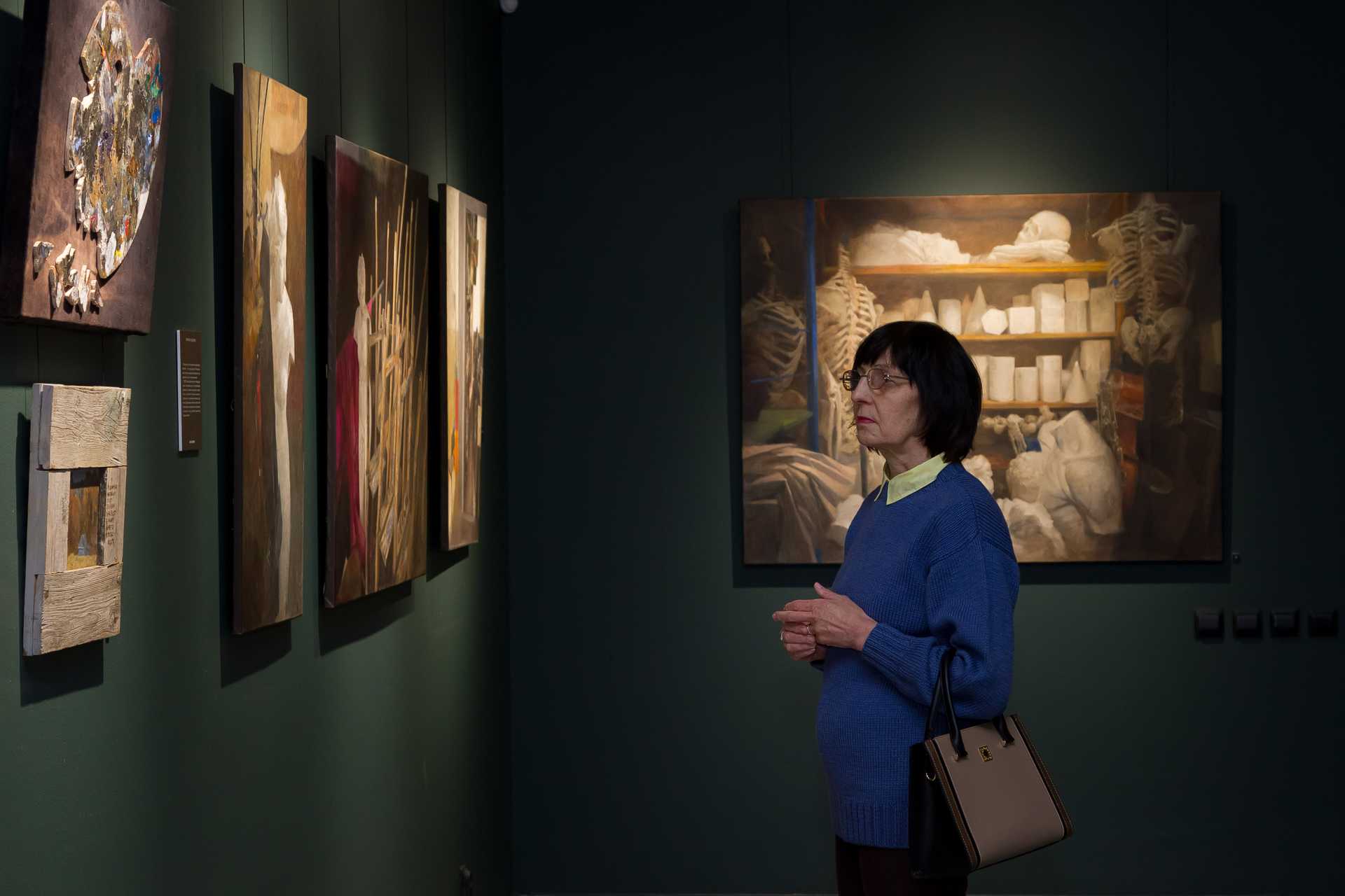 Коллективный образ художника в экспозиции складывается не только из отдельных лиц, но и из антуража жизни творца, который здесь представлен обильно и ярко. Редко когда на нынешних выставках увидишь столько натюрмортов, а здесь на полотнах — краски в тюбиках, подрамники, наборы предметов, на которых начинающие художники учатся передавать объём, — все эти гипсовые бюстики и драпировки. С натюрмортами «рифмуется» отдельная экспозиция палитр — это настоящие рабочие палитры пермских художников, но они выглядят как арт-объекты. Всё, что связано с творчеством, прекрасно, даже если это самый обиходный предмет.