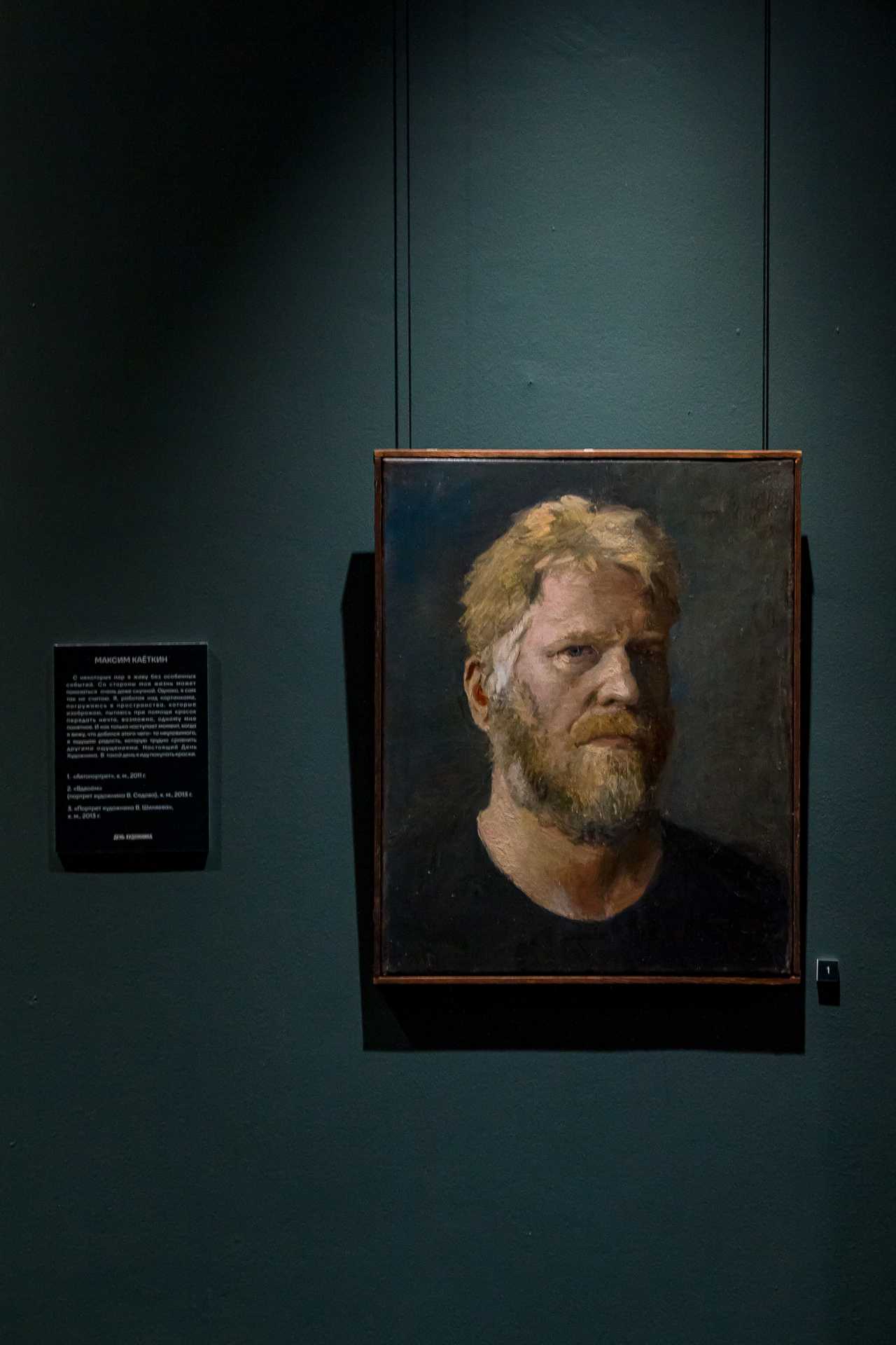 Неудивительно, что в экспозиции много автопортретов, и все они необычные. Так, Александр Казначеев изобразил себя полускрытым среди натёков краски, в причудливом, почти скульптурном рельефе полотна. Художник как будто теряется в технологиях и материалах, его личность проявляется через них, но не буквально, а в общих чертах. Юлия Трубина назвала свой автопортрет «День художника» — он создавался специально к выставке. Художница на полотне максимально собрана, готова к работе, и кисть уже в руке. Максим Титов показал себя очень реалистично, расслабленным и домашним, но сместил фокус в сторону интерьера; быт художника в его картине явлен во всём «творческом беспорядке»: тюбики с красками россыпью лежат на полу, этюдник, подрамники, болотные сапоги — всё вперемешку; судя по всему, художник только что вернулся с пленэра и позволил себе небольшой релакс, а для устроившегося в кресле кота образ жизни хозяина вполне привычен.