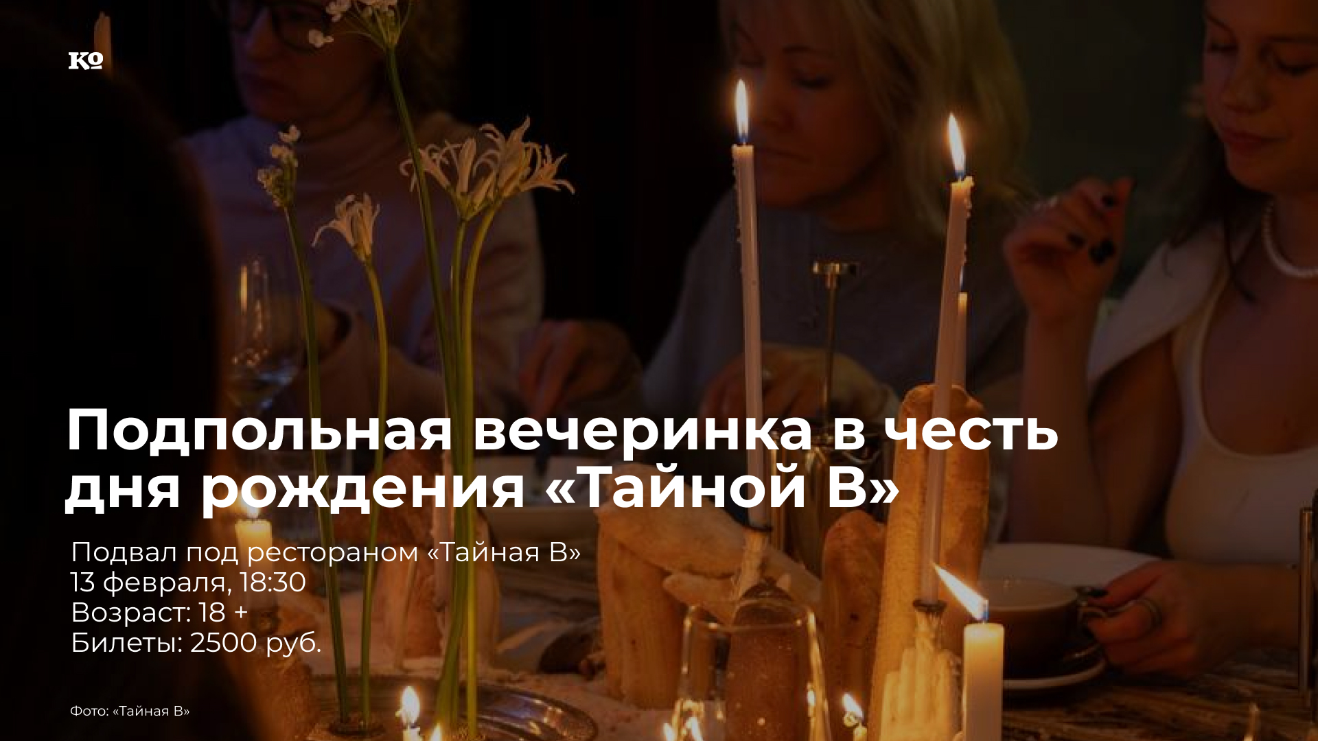 В декабре ресторану «Тайная В» исполнился год. Владельцы решили, что вместо того чтобы чинно пить просекко в ресторане, надо устроить настоящее веселье там, куда обычно вход закрыт, — в подвале под "Тайной В" на ул. 25 Октября, 45, и отметить это дело в формате камерной вечеринки без лишней суеты, с правильной музыкой и коктейлями. В программе: живое выступление elcapitan!, welcome drink для правильного настроя, два бара с авторскими коктейлями, два DJ-сета.