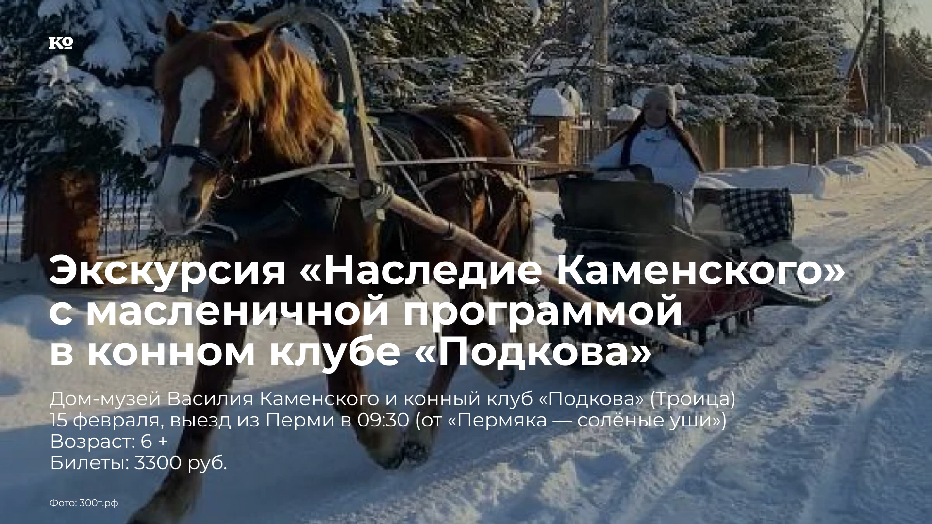 Экскурсия начнётся с погружения в творческое наследие Василия Каменского — поэта-футуриста, художника, драматурга и одного из первых русских авиаторов. В его музее расскажут о смелых идеях, поисках свободы и полёта, которые опередили своё время и стали частью культурной истории Урала. Затем — Масленица в конном дворе «Подкова»: катание на лошадях верхом и в санях, масленичные хороводы и народные игры, состязания с кнутами, стрельба из лука и бой подушками, торжественное сжигание чучела Масленицы, экскурсия по мини-зоопарку (животных можно погладить и угостить морковкой), катание с горки на тюбингах, фотосессия в народных костюмах, чаепитие с блинами и сгущёнкой. Возвращение в город — в 16:00.