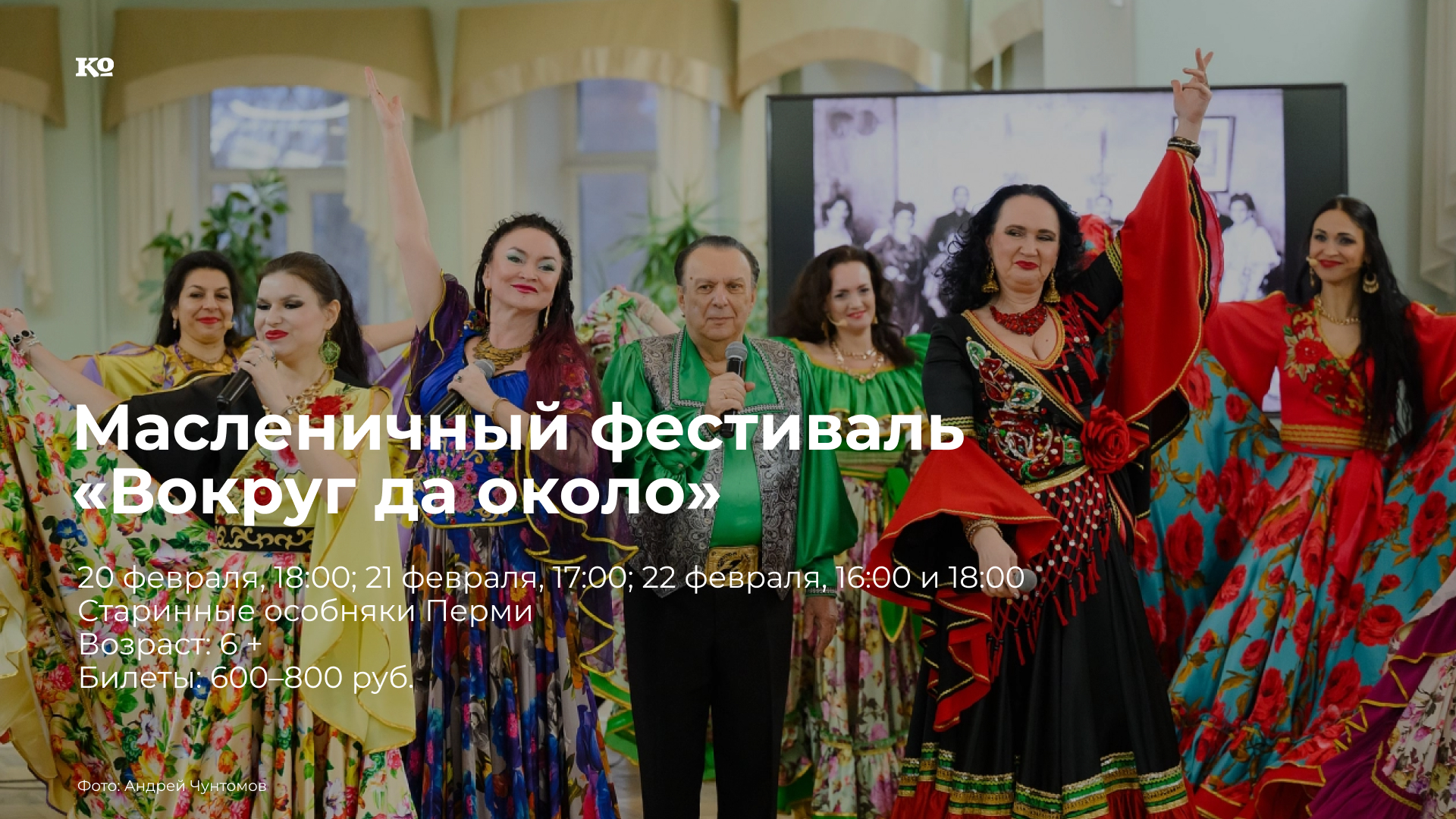 Завершается масленичный фестиваль «Вокруг да около» МАУК «ПермьКонцерт». Ансамбль песни и танца «Ромэн» на иммерсивном вечере (20 февраля, 18:00, Дом Смышляева) поможет погрузиться в культуру кочевого народа. Прозвучат старинные романсы, таборные песни, обещаны самобытные танцы, гадания на весну и рассказы из истории прикамских цыган. Премьера сольной программы Олега Костыри, актёра, солиста ансамбля «Иваны» (21 февраля, 17:00) пройдёт в пространстве Пермской арт-резиденции, наполненном искусством. Прозвучат песни и романсы о любви — «Всё, что было», «Мне осталась одна забава», «Я тоскую по Родине» и другие под аккомпанемент баяна, гитары и перкуссии. Заключительные масленичные посиделки с ансамблем народной музыки и танца «Ярмарка» «Как у наших у ворот» пройдут в новом для фестиваля месте — в краевом центре «Муравейник» (22 февраля, 16:00). Это настоящее погружение в деревенские посиделки с народными традициями масленичной недели: песнями, плясками, залихватскими наигрышами, частушками под гармошку, масленичными играми. Премьерная программа камерного оркестра «Орфей» «Прощёное воскресенье» с хоровыми коллективами Перми прозвучит в Доме С. П. Дягилева (22 февраля, 18:00) и завершит масленичный фестиваль. Прозвучит музыка Вивальди, Баха, Моцарта, Арво Пярта.
