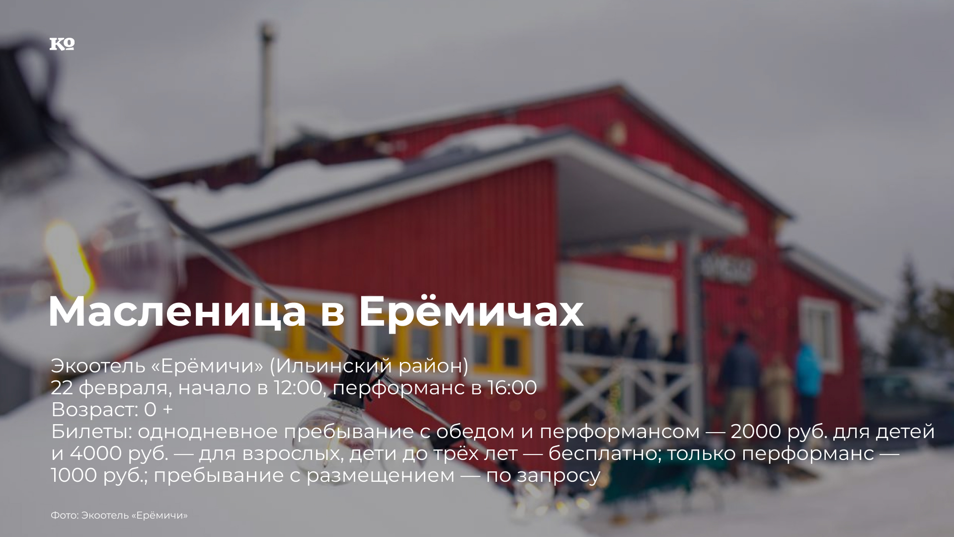 Масленица в «Ерёмичах» пройдёт по сложному сценарию. С 12:00 до 16:00 — «безразмерный обед» с солянкой на гусином бульоне и множеством авторских блинов с разнообразными начинками от шефа Сергея Юрина. В это же время — концерт ансамбля «Аристократ» под открытым небом, мастер-класс по изготовлению арт-объектов «солнышко» с художницей Ксенией Топычкановой, массовые гуляния и забавы: катание на санях, взятие снежного городка, перетягивание каната, Ice боулинг, городки, хороводы, песни и пляски. В 16:00 — перформанс «Светило» с огненным арт-объектом от резидентов Театра-Театра — режиссёра Марка Букина и режиссёра-хореографа Ксении Малининой. Дресс-код — тулупы, валенки, шали. Автор самого стильного образа будет премирован приглашением на гастрономический ужин.