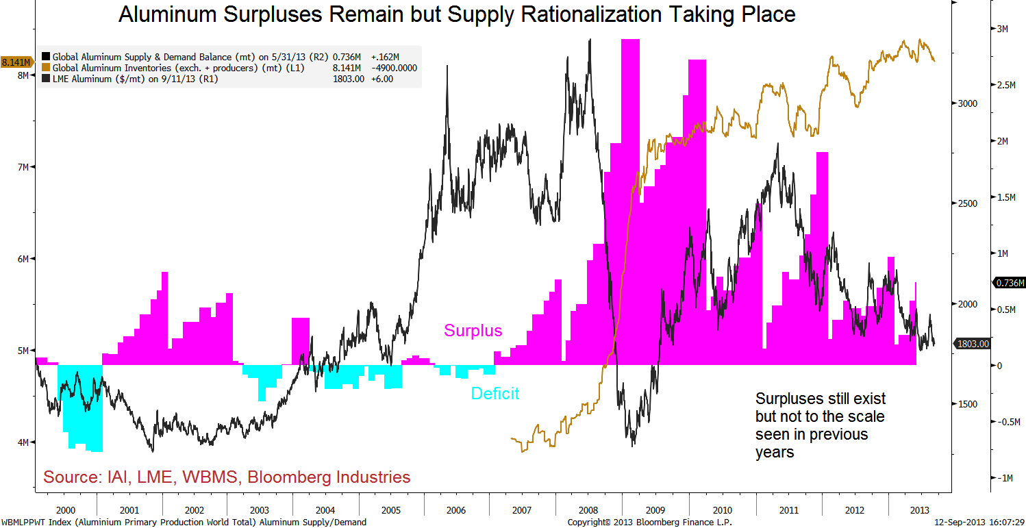 Подобный вариант сейчас наблюдается на рынке металлов, который страдает от «овершутинга» после замедление сырьевого суперцикла. Например возьмём данные по рынку алюминия (рис. ниже). После достижения пика в $3300 за т. перед кризисом, цены в посткризисный период смогли достичь уровня в $2800 за т., что примерно соответствует уровню маржинального производителя. Восстановившиеся цены позволили закончить проекты, запущенные до 2008 г., что создало избыточное предложение на рынке. Стоит отметить, что такая ситуация закономерна, поскольку рецессия всегда наступает неожиданно и всегда нарушает планы компаний, в результате чего они оказываются в состоянии, когда долги под проекты уже взяты, а запустить их не удаётся из-за сжатия ликвидности в финансовом секторе и низких цен на продукцию.