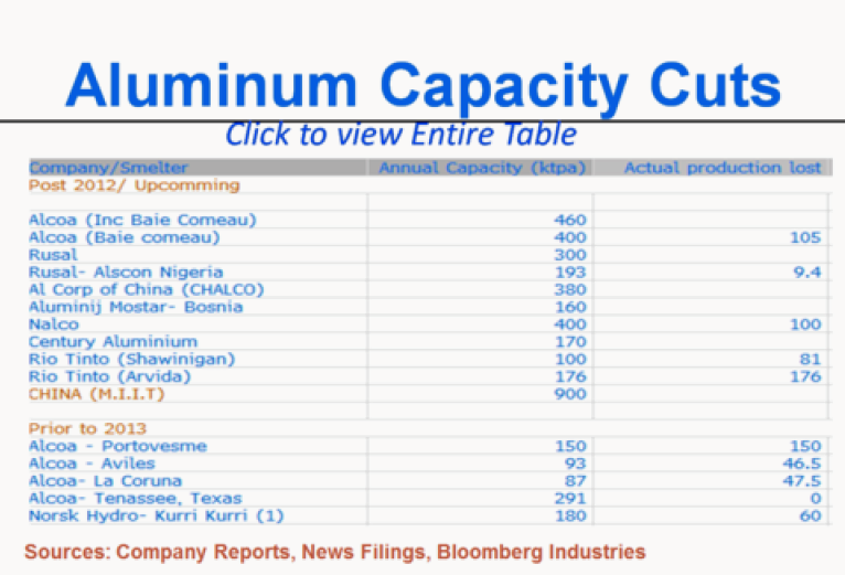 Опять же, говоря про рынок алюминия, видно, что существенный избыток (surplus, обозначено на графике розовым) постепенно сходит на нет за счёт вывода из строя неэффективных мощностей. Всего к концу 2014 г. планируется снизить выпуск на 3,2 млн. т. или около 7% мирового производства, что много. Планы по отдельным компаниям представлены ниже: