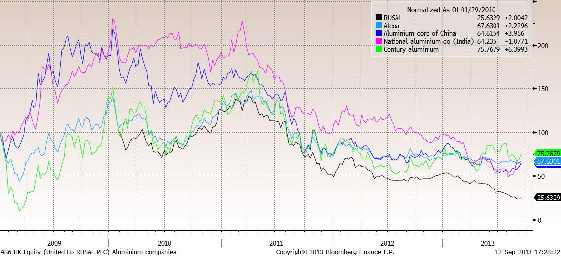 Котировки алюминиевых компаний следуют за ценами на алюминий (график ниже). Больше всех потерял «Русал», возможно сказывается асексуальность российского рынка, а может значительная долговая нагрузка и важный для отрасли рост тарифов на электроэнергию. Тем не менее, мы планируем, что при уравновешивании спроса и предложения на рынке котировки окажутся сильно недооценёнными. И фаза роста мировой экономики, которая придётся как раз на это время, подстегнёт цены к росту.