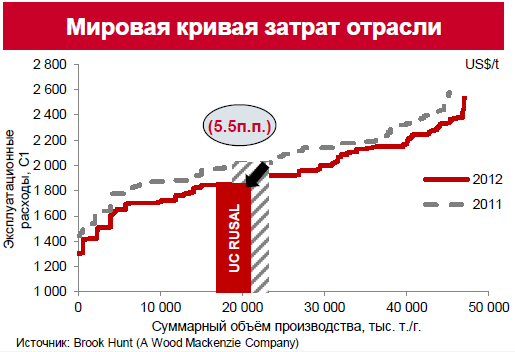«Русал» по его данным находится ниже середины кривой издержек, что позволит ему получать неплохую прибыль (график ниже). Здесь представлены затраты C1, т.е. затраты на операционную деятельность, не считая амортизации, процентных и нерегулярных расходов. Точно рассчитать прибыль «Русала» при выравнивании цен довольно сложно — кривая издержек непостоянна во времени, оценивается каждый год, поэтому и размер маржи нестабилен. Кроме того, компания закрывает сейчас ряд неэффективных производств, а производит не только первичный алюминий, да и дивиденды, получаемые от пакета «Норникеля» существенны. Но, если считать, что цена установится на уровне примерно в $2250 за т., а издержки компании около $1800 за т. + $60 за т. амортизация, то операционная прибыль составит среднесрочно (после стабилизации цен) порядка $1,6 млрд. Ещё около $800 млн. добавят дивиденды «Норникеля» (считается, что правильнее оценивать непрофильные активы отдельно, а потом добавлять стоимость, но на практике получается, что в этом случае в итоговый вариант может закрасться двойная ошибка прогнозирования — по операционной деятельности и по непрофильной). Процентные выплаты составляют также порядка $800 млн. После налогов компания будет иметь около $1,3 млрд. Исходя из мультипликатора P/E=6 компания должна стоить $7.8 млрд., при P/E=8 капитализация будет $10,4 млрд. Сейчас компания стоит $4,7 млрд. Соответственно недооценка составляет от 65 до 120%. Мы считаем, что инвестиции в «Русал» или другие алюминиевые компании сейчас оправданы. Главное следить за уровнем долга, который у компании находится на высоком уровне (около $10 млрд. чистого долга или при нынешних показателях Долг/EBITDA=8.3), чтобы не было дефолта.