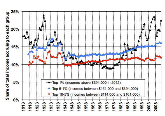 «Богатые становятся богаче», так звучит заголовок недавней статьи в The Economist, в основе которой лежит исследование экономиста Emmanuel Saez из Калифорнийского университета в Беркли. Неравенство доходов среди населения существенно увеличилось за последнее время. Если вспомнить послевоенную американскую историю, то апогей равномерного распределения доходов между гражданами был достигнут при Ф. Рузвельте и его «Новом курсе». Этот период (1920-1950 гг.) ознаменован как «великое сжатие». Благодаря безумному росту налогов на прибыль компаний и доходы (налог был повышен аж до 91% ) произошло сокращение разрыва доходов между богатыми и трудящимися классами. Но после подписания Акта о гражданских правах 1964 г. бремя социального обеспечения стали нести не только богатые, но и средний класс, расовая ориентированность соцпрограмм подорвала доверие власти. Следствием этого стал тот факт, что подписанием акта либералы, можно сказать, подарили республиканцам Юг в качестве своих избирателей (П. Кругман «Кредо либерала»). Средний класс начал постепенно разрушаться, что в купе со снижением налогов на богатых с приходом республиканца Рейгана в 80-м году это усилило дифференциацию между доходами населения, возрастающую по сей день.