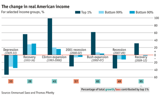 Обращаясь к графику, нетрудно заметить, что во время восстановления и роста американской экономики большую часть одеяла на себя перетягивает верхушка общества. Правда бОльшие потери во время кризисов также несут верхние слои населения. Например, в период с 1993 по 2012 гг. рост реальных доходов нижних 99% населения составил 6,6%, в то время как верхний 1% (с доходом выше $394 тыс.) слой населения имел 86%-ый рост доходов со среднегодовой ставкой 3,3%.