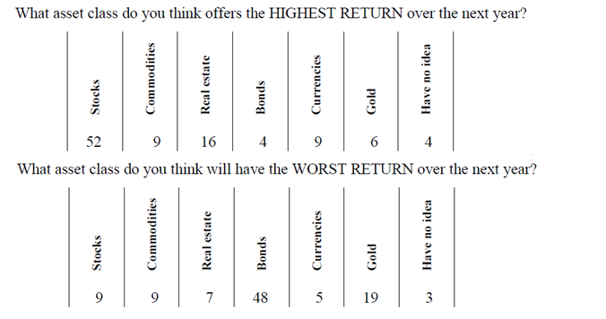 Наиболее привлекательным активом в контексте доходности в следующем году респонденты считают акции, наихудшим — облигации. Эра нулевых ставок заканчивается, облигации становятся менее доходным активом.