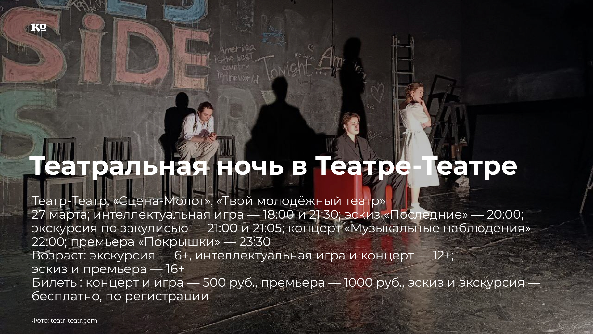 Всемирный день театра в ТТ встречает зрителей разнообразной афишей: можно сходить в театр всей семьёй, увидеть эскиз и премьеру, поиграть в интеллектуальную игру, попасть за кулисы и не только. Событий очень много. Эскиз спектакля «Последние» по пьесе Горького — суровый, но честный разговор о границах любви и цене безответности, история распада семьи. Режиссёр эскиза «Последние» — Илья Лямин. Спектакль Марка Букина «Покрышки» — это «читка-рейв», история взросления во дворах, окружённых панельными домами. Это история о времени, когда всё казалось возможным, но сделать ты ничего не мог. Это история о дружбе. О первой любви. О мечте. О невыносимо сложных вопросах и, конечно же, о смелости. Главный герой Аркаша живёт во дворе и по правилам двора. У него есть его пацаны, и вместе они тусят и делают свои «дела». Но однажды в жизни Аркаши появляется она, и вся его жизнь тут же меняется. Аркаша — совершенно неожиданно — решает стать музыкантом! Класс-концерт — первое выступление студентов второго курса специальности «Артист музыкального театра». Одним из предметов, которые изучают будущие актёры, является наблюдение. Объектом наблюдения студентов стали зарубежные и отечественные исполнители: Андреа Бочелли, Лайза Минелли, Мерилин Монро, Элвис Пресли, Дженнифер Лопес, Sia, Lizzo, Том Йорк, группы Ricchi e Poveri, Muse, «Комбинация» и «Кармен».