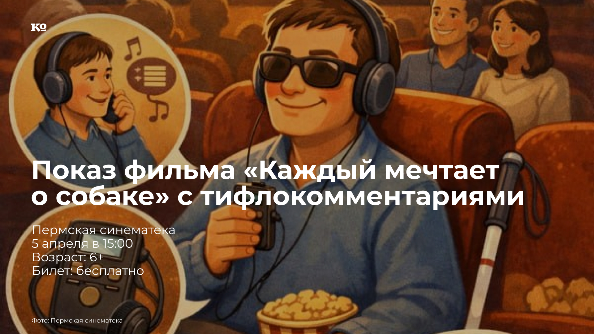 Пермская краевая специальная библиотека для слепых и Пермская синематека запустили бесплатные инклюзивные показы семейных фильмов в рамках проекта «Счастливый билет». Теперь люди с особенностями здоровья зрения смогут посмотреть любимые картины благодаря тифлокомментариям – специальным звуковым описаниям происходящего на экране. Они помогают увидеть фильм через детализированные подсказки о действиях, обстановке и эмоциях героев. Как попасть на сеанс: установить приложение «Особый взгляд» (Special View) с сайта svtiflo.ru; в приложении «Кино» найти нужный фильм и загрузить звуковую дорожку с тифлокомментариями; записаться на сеанс по телефону Пермской краевой специальной библиотеки: 8 (342) 212‑92‑54.
