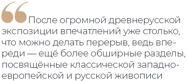 Любопытно деление русского раздела по залам: здесь принят на вооружение не только хронологический принцип, но и жанровый; так, в отдельную экспозицию выделена сюжетно-бытовая живопись, и очень представительная её подборка дополнена внятными текстами об особенностях этого жанра в русском искусстве.