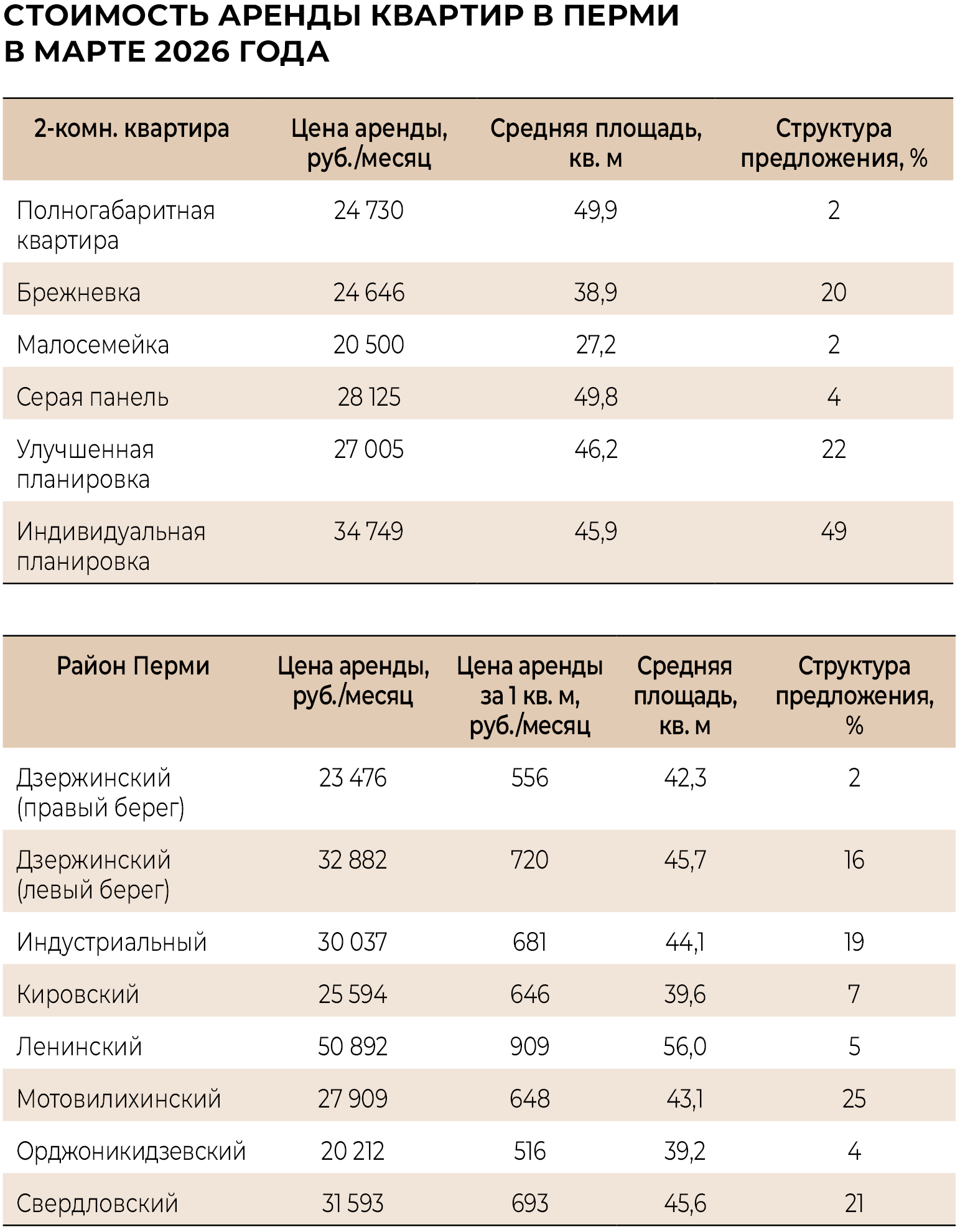 Лидером по объёму предложения стал Мотовилихинский район: здесь сдаётся четверть от всего городского предложения. При этом уровень средней цены аренды не говорит о том, что предложение превышает спрос.