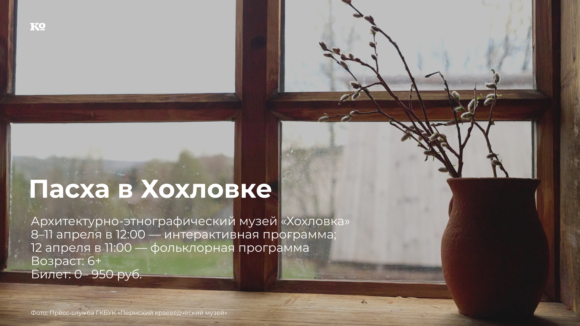 8-11 апреля «Хохловка» приглашает на интерактивную программу «От Благовещенья до Пасхи». Праздники и обряды пасхального цикла были одними из наиболее значимых в народном календаре русских Прикамья. Они связывались с весенним новолетием, началом нового земледельческого года, весны. Пасхальный цикл растягивался на продолжительное время и включал такие важные даты, как Благовещенье, Средокрестье, Вербное воскресенье, Великий четверг и Пасха. Гости музея научатся старинным способам окрашивания яиц, выучат обрядовые обходные песни, которые исполнялись на Пасху, поиграют в молодёжные игры на соломе, примут участие в обрядах Великого четверга — «загребут» счастье в дом, научатся прясть обережную «шулепную» нитку. 12 апреля — фольклорная программа «Пасха в «Хохловке». Посетители музея узнают о традициях празднования Пасхи, побывают на пасхальном концерте студии «Тишина», примут участие в традиционной забаве — катании пасхальных яиц. Научатся делать пасхальный пихтовый венок — на Пасху ветками пихты украшали божницу и дома в южных районах Пермского края. В этот день, с 13:00 до 17:00, в начале каждого часа будут звучать колокола на шатровой колокольне из села Сыра Суксунского района.