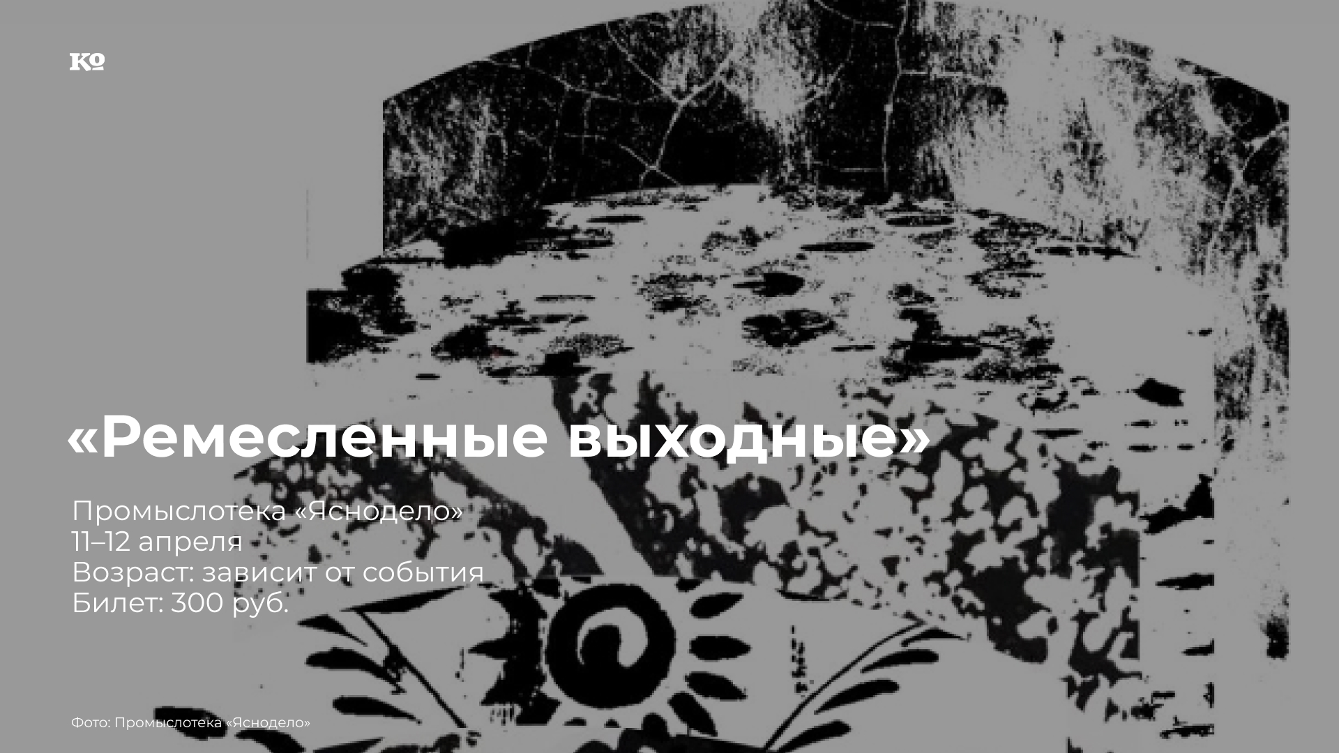 Так, 11 апреля в 14:00 и 15:00 состоится урок ремесла по росписи (6+), где участники распишут деревянные лопатки акриловой краской, узоры будут вдохновлены традиционными видами росписи, распространёнными в Пермском крае; урок ремесла по тряпичной кукле (6+) — занятие по изготовлению пасхальной тряпичной куклы: Вербница, Пасхальная голубка, Пасхальная на яйцо и Пасхальная со святыми дарами. 12 апреля в 14:00 и 15:00 пройдёт урок по кружевоплетению на коклюшках (12+) с народным мастером Пермского края Татьяной Чащиной, где участники узнают о центрах кружевоплетения в России и чем они отличаются друг от друга и научатся технике плетения на коклюшках; в 14:00 и 16:00 на уроке по плетению из рогоза (12+) участники смогут создать коврик из листьев рогоза в технике плетения жгутом.