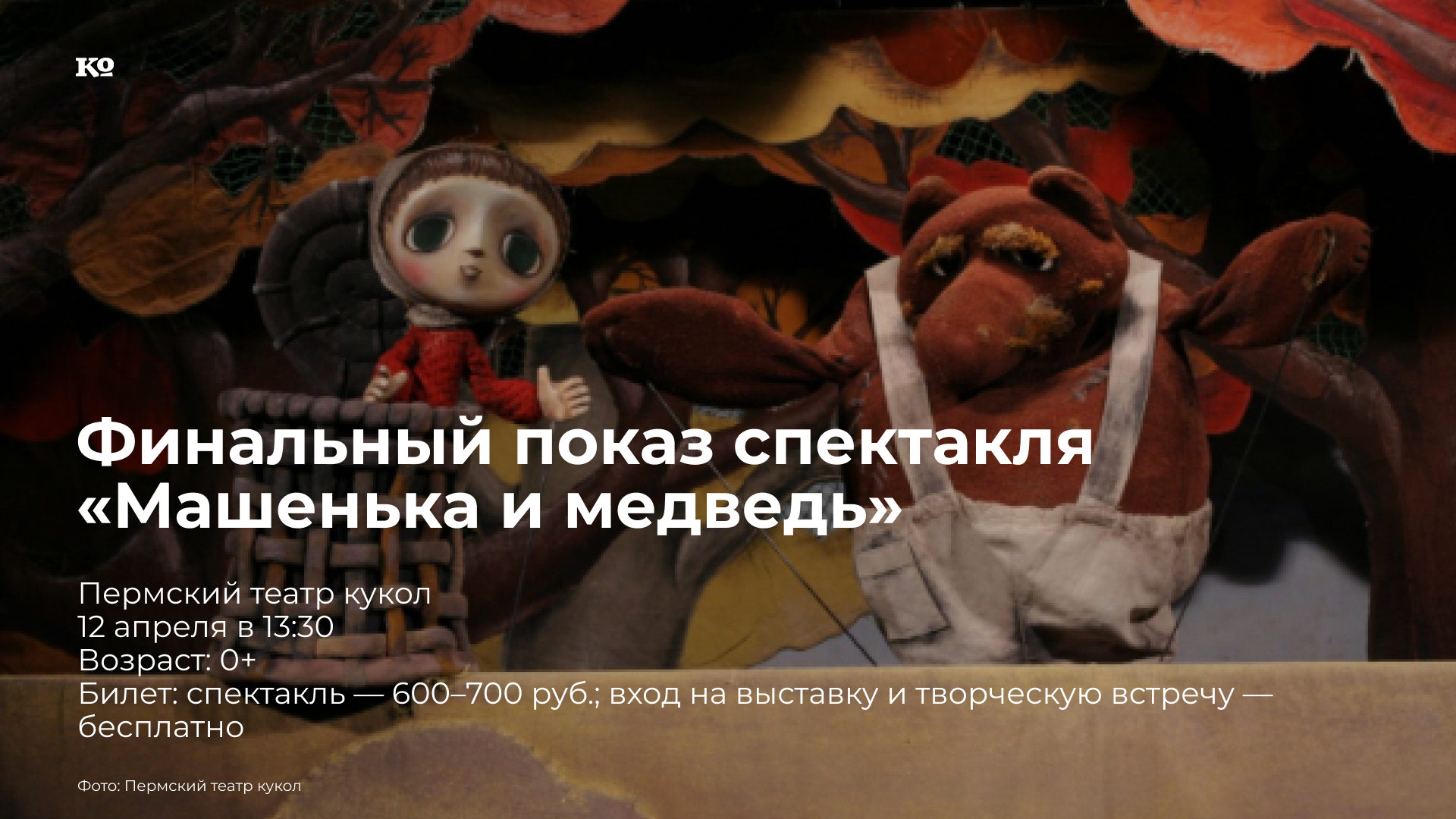 В этот день пройдёт торжественное открытие выставки об истории постановки и творческая встреча с актёрами и бессменной Машенькой, которую играет заслуженная артистка РСФСР Лариса Нагогина. Героиня в её исполнении — тростевая кукла с огромными выразительными глазами — воплощение радостной светлой души, которая вносит гармонию в окружающее. В этот день на сцене будут чествовать актрису, которой 9 апреля исполнилось 80 лет. Сказка «Машенька и медведь» идёт на сцене Пермского театра кукол вот уже 40 лет — это более 800 показов, несколько десятков тысяч зрителей и множество благодарных отзывов малышей и взрослых. Перед началом показа в 13:15 в фойе театра откроется выставка «Спектакль, покоривший сердца», которая расскажет об истории постановки и её создателей. Зрители впервые увидят уникальные экспонаты: японскую книжку «Маша и медведь», подаренную во время гастролей в Токио, программку на английском языке с гастролей в США и многое другое. В 15:00 в большом зале театра состоится творческая встреча с артистами спектакля, психологами Анной Дрожиловой и Анастасией Фомичёвой, журналистами и театральными блогерами.