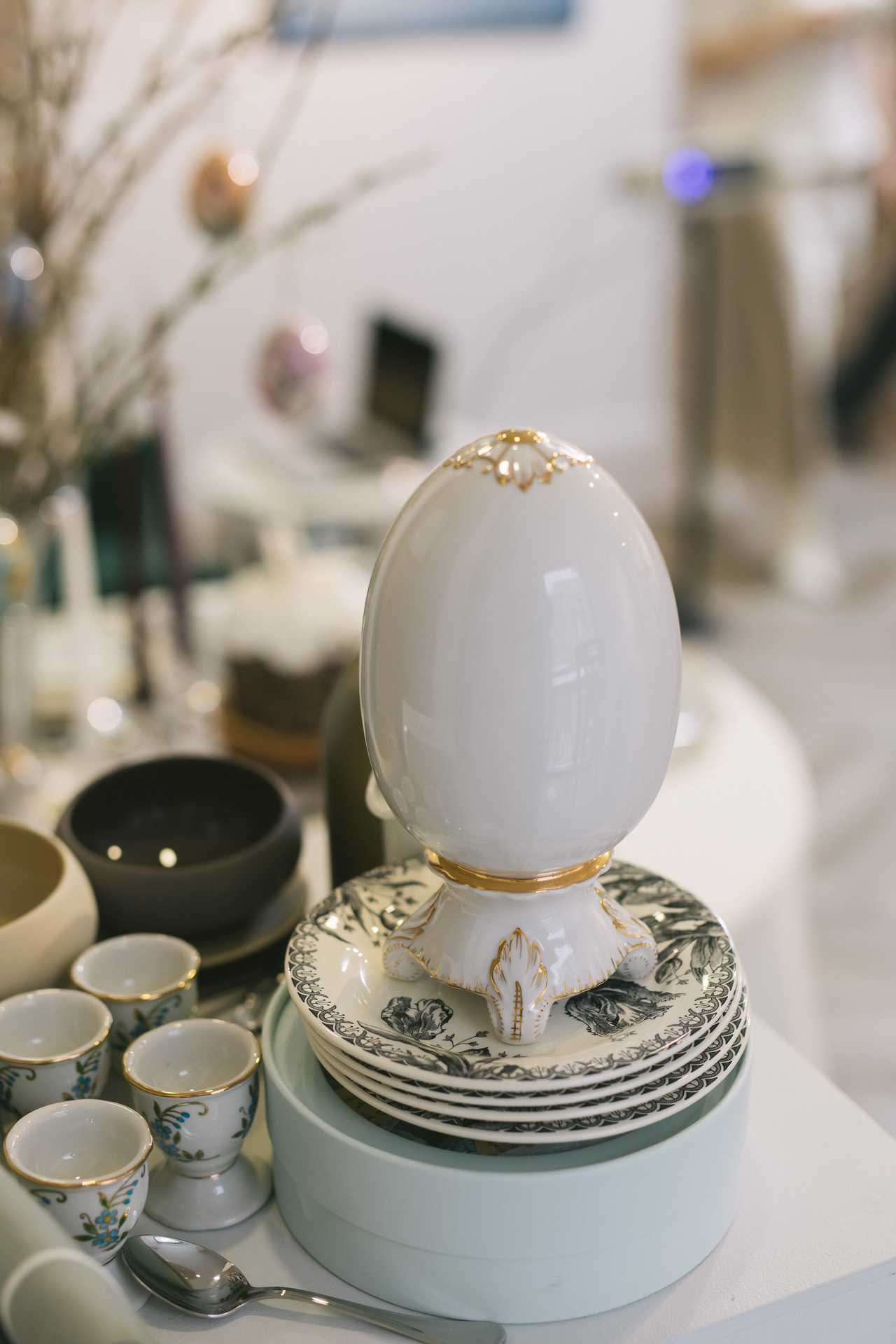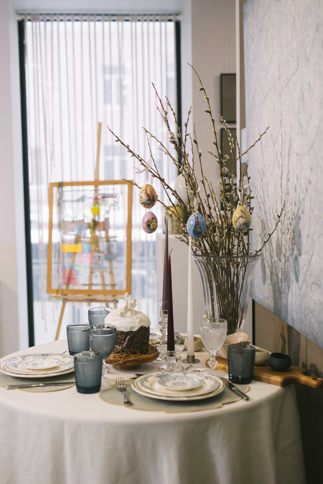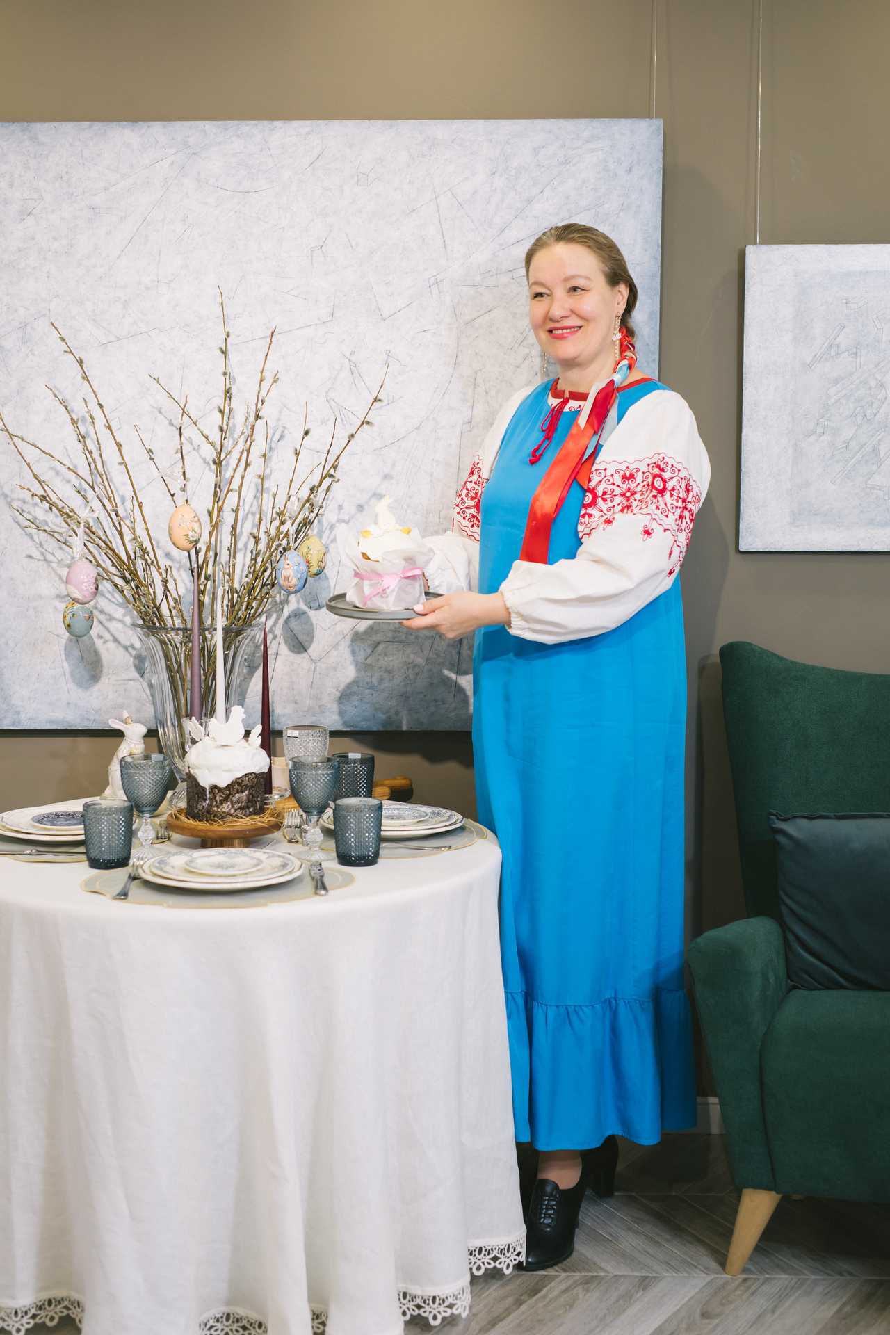 Кстати, салон «Марфа», хоть и специализируется на посуде, к празднику предлагает и традиционные подарки, в том числе расписные декоративные яйца ручной работы — лаковую миниатюру на дереве с сюжетными рисунками или с орнаментом. Такие яйца на ленточках красиво выглядят на веточках вербы, которые можно поставить на стол в виде букета, как это и было сделано на пасхальном вечере. Фарфоровые зайчики или цыплята очень оживляют пасхальный стол, есть в «Марфе» и традиционные для России фарфоровые пасхальные барашки.