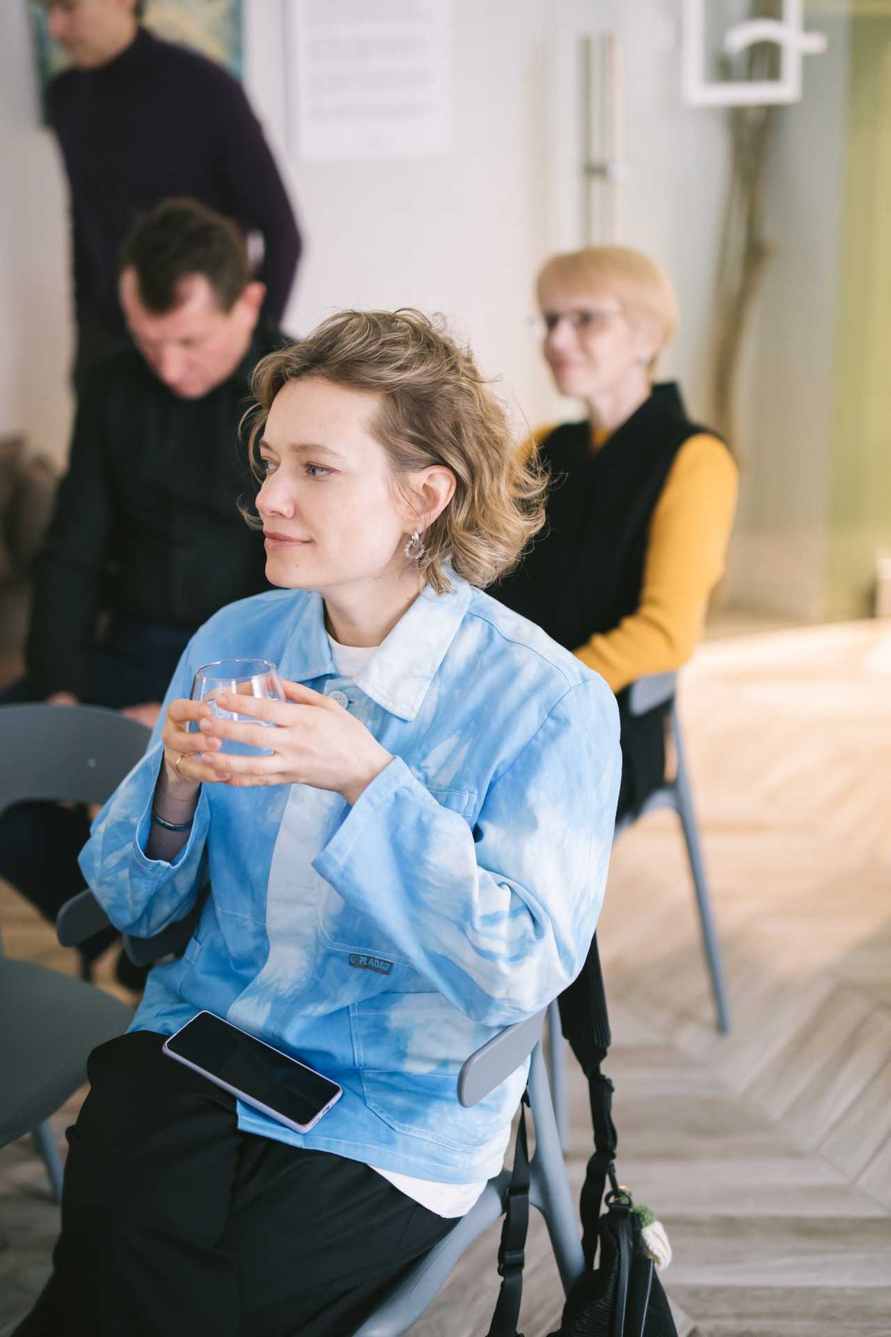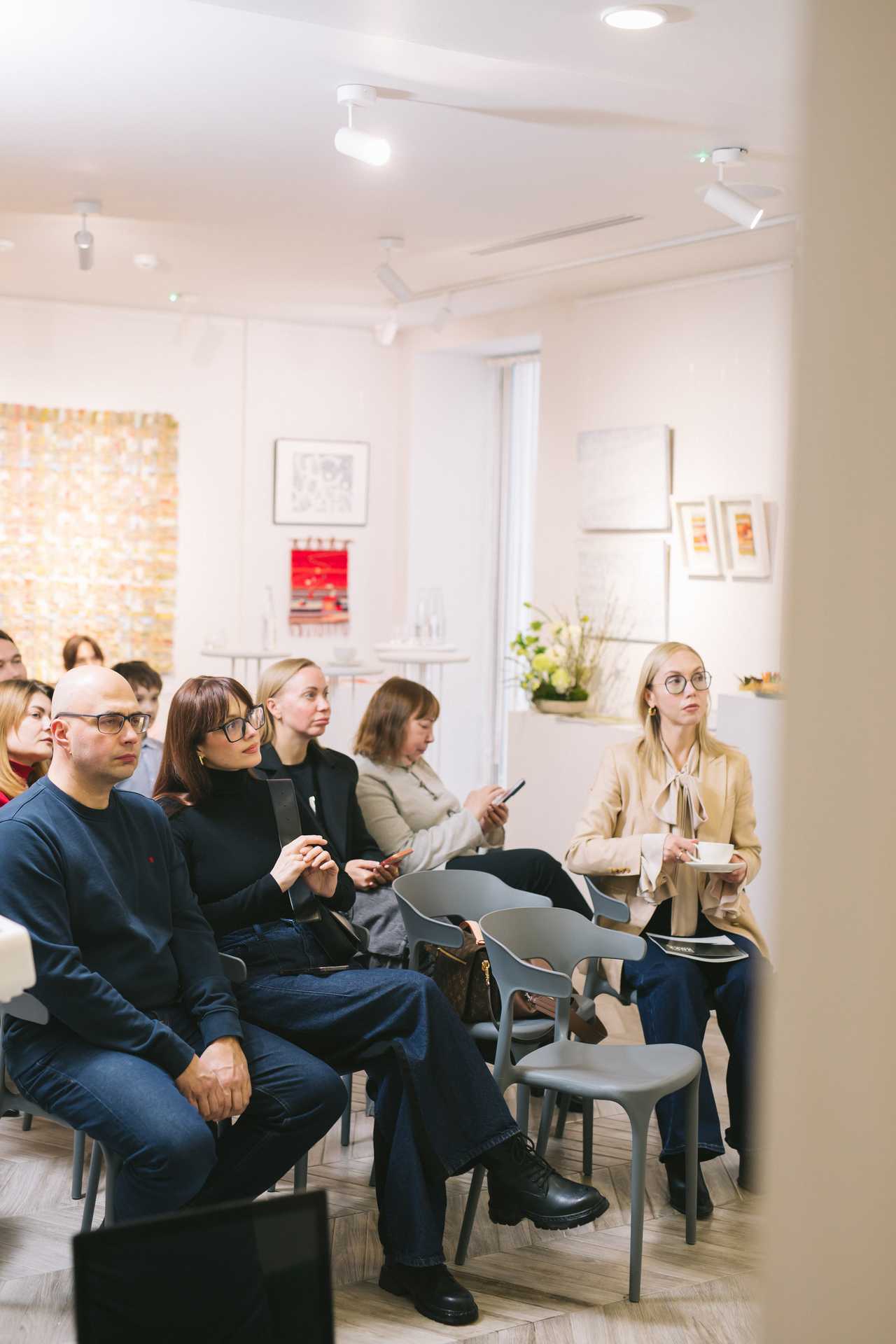 В галерее как раз открылась выставка Андрея Побережника «Некий мир» (0+), и встреча началась с небольшой экскурсии по ней. Побережник — один из лидеров пермского абстрактного искусства, мастер загадочных композиций, в которых хочется видеть зашифрованное послание. Большинство его произведений выполнены в сложной технике, когда краска накладывается слоями, тщательно и долго растушёвывается, в результате чего образуются тонкие цветовые градиенты и возникает иллюзия перспективы; поверх этого фона Побережник наносит миниатюрные детали в технике сграффито — процарапывания. Его картины — это пейзажи иных миров, письмена исчезнувших цивилизаций и голоса нечеловеческих существ.