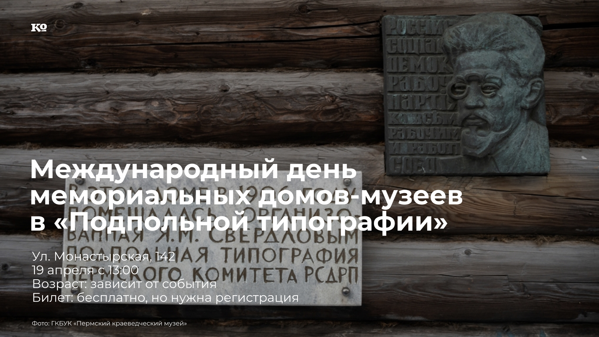 Дом-музей «Подпольная типография» в Перми примет участие в международной акции, посвящённой мемориальным домам-музеям. Это событие объединяет более 370 музеев из 40 стран мира и проводится под эгидой ИКОМ, комитета домов-музеев и исторических зданий (DEMHIST) и международного комитета литературных музеев и музеев композиторов (ICLCM). Акция направлена на привлечение внимания к мемориальным домам-музеям и на предоставление посетителям возможности познакомиться с их экспозициями. Программа: 13:00 — медиация по выставке «Коннект» (16+), где участники познакомятся с выставкой «Коннект», изучат прошлое и попытаются найти схожие и различные черты «Подпольной типографии» с самими собой; 14:30 — авторская экскурсия «От подпола до Подполки» (12+) — история о том, как в начале XX века в обычном доме в центре города начала свою работу тайная подпольная типография; 15:30, 17:30 — дрейф по дому-музею «Подпольная типография» (16+).