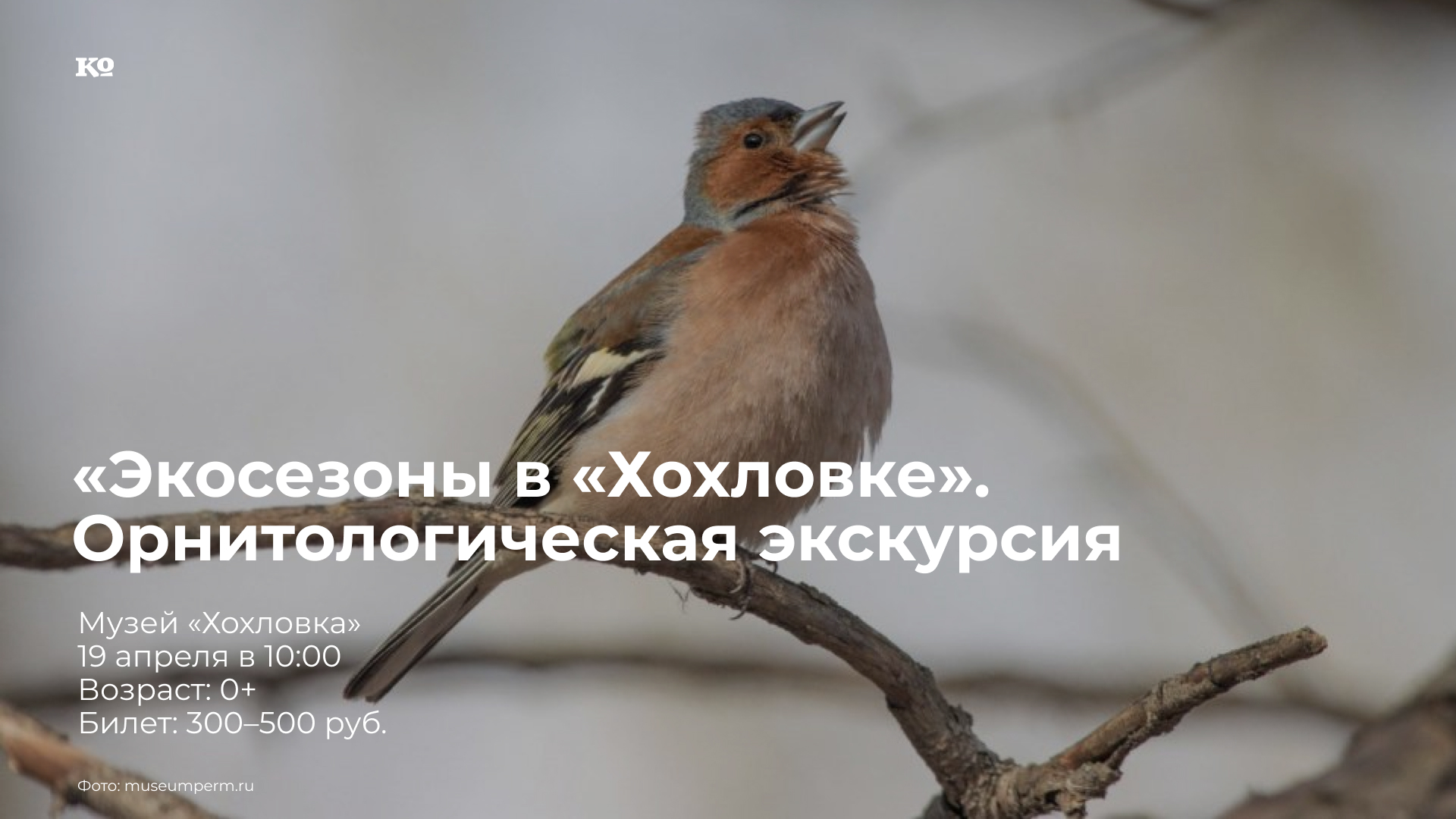 В апреле и мае архитектурно-этнографический музей «Хохловка» предлагает познакомиться с растительным и животным миром музея, узнать о строении и рельефе хохловского холма, о мелководном море пермского периода. Проект «Экосезоны в «Хохловке» направлен на раскрытие природного потенциала музея. «Экосезоны» открывает орнитологическая экскурсия от Дениса Исакова, орнитолога, специалиста Управления по экологии и природопользованию Перми. Апрель — отличное время для того, чтобы начать знакомство с миром птиц. Ещё есть время, чтобы ознакомиться как с типично зимующими нашими пернатыми (снегирями, свиристелями, дроздами), так и с теми, что первыми прибывают с мест зимовок (зеленушками, чайками, зябликами). Кроме того, на прогулке участники смогут посмотреть на гнездовья птиц, находящиеся на территории музея, а также узнать о календаре их прилета.