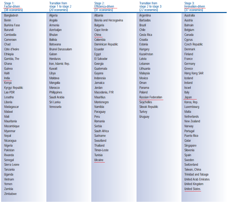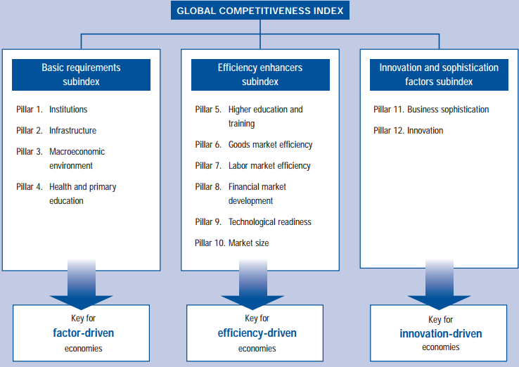 Логика развития стран предполагает три стадии: начальный рост бедных стран определяемый факторами производства. Затем следует рост, определяемый эффективностью для стран со «средним доходом». И на финальной стадии для богатых стран, происходит рост, движимый инновациями. WEF выделяет 12 основных «стержней», определяющих успех. Однако влияние этих стержней является разным для названных стадий развития.