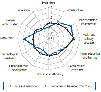 Для России проблемными являются государственные институты (суд, госуправление, силовые органы), есть проблема с инновационной активностью. Вот цитата: «On the other hand, the country continues to receive a poor assessment of its public institutions (118th) and shows a lack of innovation capacity (78th). Russia suffers from inefficiencies in the goods (126th), labor (72nd), and financial (121st) markets. The weak level of competition (135th) —caused by inefficient anti-monopoly policies (116th) and high restrictions on trade and foreign ownership as well as a lack of trust in the financial system (132nd) —contributes to this inefficient allocation of Russia’s vast resources, hampering higher levels of productivity in the economy. Moreover, as the country moves toward a more advanced stage of economic development, its lack of business sophistication (107th) and low rates of technological adoption (127th) will become increasingly important challenges for its sustained progress».