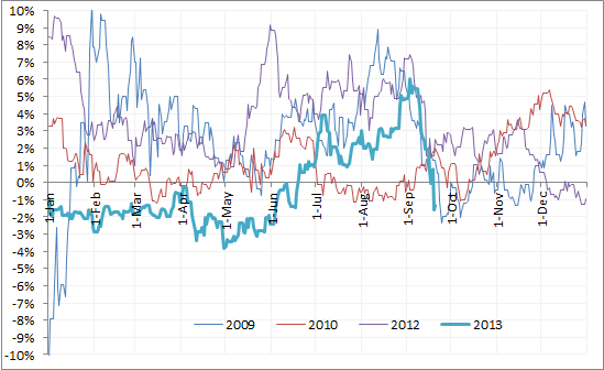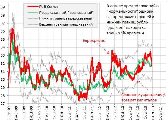 Предположительно это обратная сторона относительной дешевизны рубля в августе, которую объясняют сезоном выплаты дивидендов и сезонным спросом на валюту для отпусков. Если верить этому графику, то рубль близок к пределу укрепления. Интересно, что сентябрьская тенденция к укреплению выглядит очень четкой по сравнению с другими месяцами. Однако нельзя исключать что это лишь иллюзия, что просто так совпали факторы, что рубль укреплялся в сентябре 2009-2013 гг., и что в будущем это не будет работать.