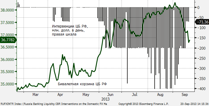 Интересно, что Центробанк РФ проводил интервенции даже 19 сентября, когда курс уже был примерно на тех же уровнях, что и сейчас — около 31.6 руб./$. Похоже, что ЦБ РФ в большей мере ориентируется на бивалютную корзину, которая по-прежнему дешевая (из-за дорогого евро к доллару). В мае интервенции начались когда бивалютная корзина прошла уровень в 36. В этой логике закончиться они должны, когда курс укрепится еще на 70-80 копеек с текущего уровня корзины в 36.78.