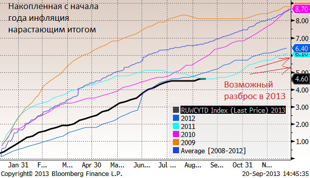График как течет инфляция в России. Это накопленная с начала года инфляция, которую Росстат еженедельно публикует (по средам, за прошлую неделю). Показатель 2013 года на 16 сентября составлял 4.6%. Это соответствует темпам которые были в 2011 году, когда проходила заметная сезонная плодоовощная дефляция. Но в 2001 году затем цены ускорились, тогда как сейчас такого движения не ожидается. В зависимости от скорости инфляции до конца года она может составить диапазон от 6.1% до 5.5%. Мы ожидаем 5.8%, тогда как консенсус в «Блумберг» на 4 квартал составляет 5.9% с разбросом от 5.2% до 6.5%.