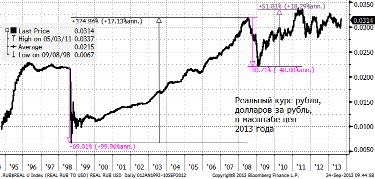 Российский рубль к доллару колеблется в «боковом тренде», если очистить от инфляции (см. индекс реального обменного курса RUB/USD ниже, рыночный курс скорректирован на инфляцию).