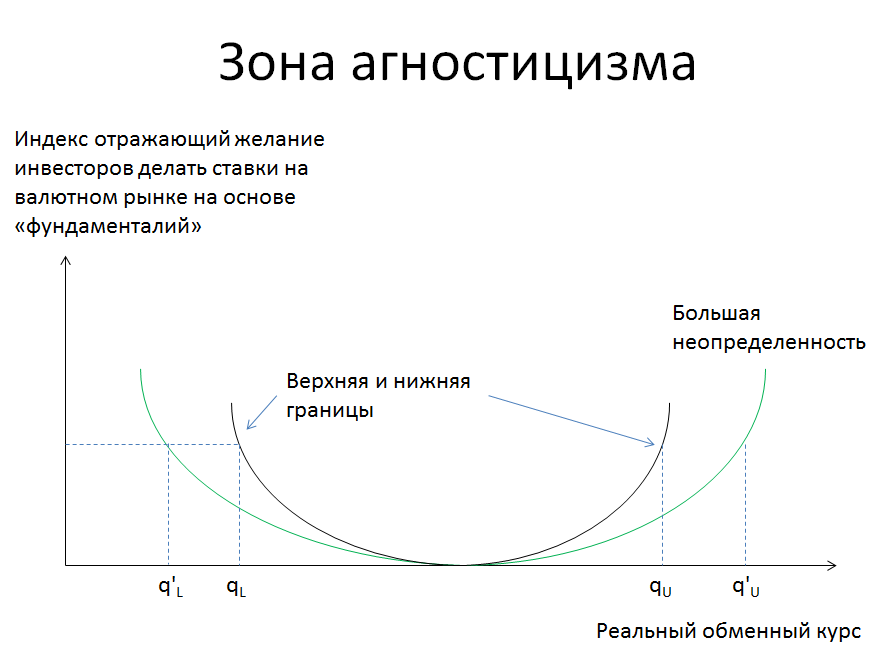 В настоящее время обменный курс рубля можно считать сбалансированным. Принятие решений на основе фундаментального анализа предполагает значительные отклонения от равновесия, так, чтобы можно было делать ставки на возврат к эквилибриуму. Рисунок ниже отражает эту идею (по мотивам книги Майкла Розенберга «Exchange Rate Determination»)